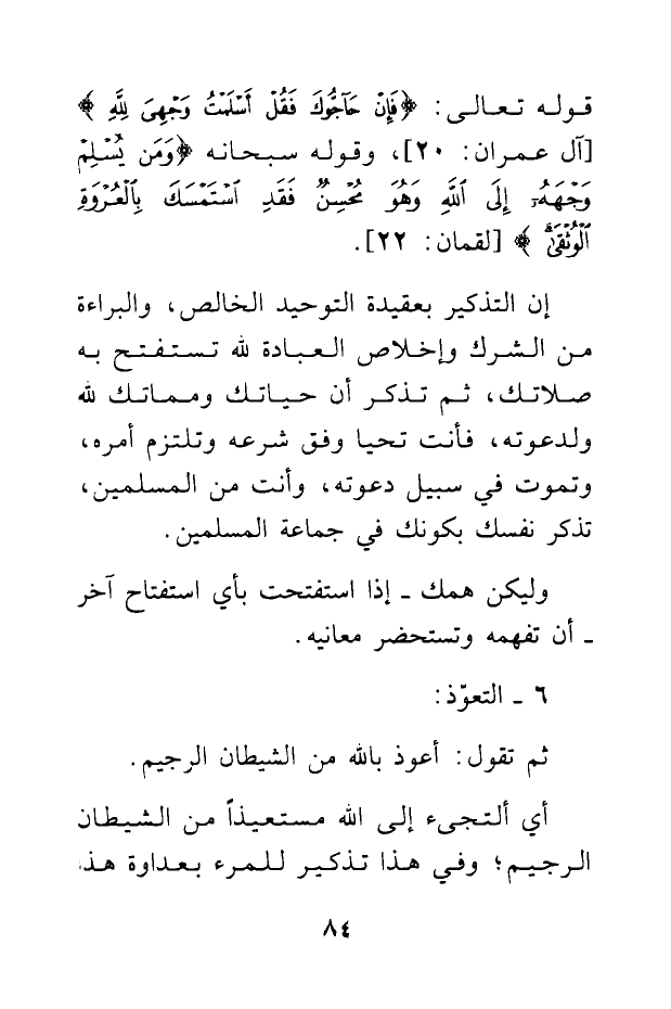 إن التذكير بعقيدة التوحيد الخالص، والبراءة من الشرك وإخلاص العبادة لله تستفتح به صلاتك، ثم تذكر أن حياتك ومماتك لله ولدعوته، فأنت تحيا وفق شرعه وتلتزم أمره، وتموت في سبيل دعوته، وأنت من المسلمين، تذكر نفسك بكونك في جماعة المسلمين.