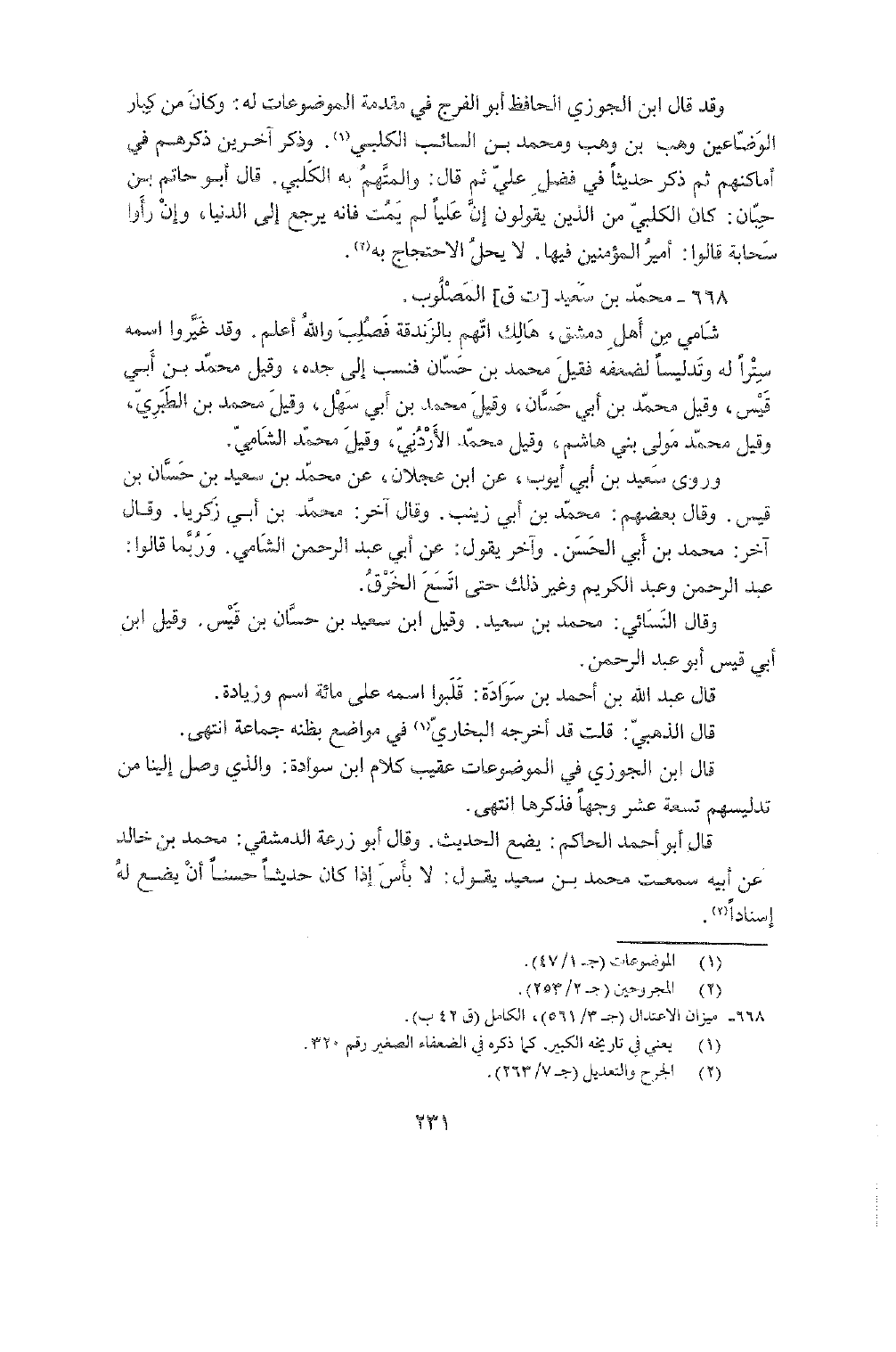 668 - مُحَمَّد بن سعيد ت ق المصلوب شَامي من أهل دمشق هَالك اتهمَ بالزندقة فصلب وَالله أعلم وَقد غيروا اسْمه سترا لَهُ وتدليسا لضَعْفه فَقيل مُحَمَّد بن حسان فنسب إِلَى جده وَقيل مُحَمَّد بن أبي قيس وَقيل مُحَمَّد بن أبي حسان وَقيل مُحَمَّد بن أبي سهل وَقيل مُحَمَّد بن الطَّبَرِيّ وَقيل مُحَمَّد مولى بني هَاشم وَقيل مُحَمَّد الأردني وَقيل مُحَمَّد الشَّامي وروى سعيد بن أبي أَيُّوب عَن بن عجلَان عَن مُحَمَّد بن سعيد بن حسان بن قيس وَقَالَ بَعضهم مُحَمَّد بن أبي زَيْنَب وَقَالَ آخر مُحَمَّد بن أبي زَكَرِيَّا وَقَالَ آخر مُحَمَّد بن أبي الْحسن وَأخر يَقُول عَن أبي عبد الرَّحْمَن الشَّامي وَرُبمَا قَالُوا عبد الرَّحْمَن وَعبد الْكَرِيم وَغير ذَلِك حَتَّى اتَّسع الْخرق وَقَالَ النَّسَائِيّ مُحَمَّد بن سعيد وَقيل بن سعيد بن حسان بن قيس وَقيل بن أبي قيس أَبُو عبد الرَّحْمَن قَالَ عبد الله بن أَحْمد بن سوَادَة قلبوا اسْمه على مائَة اسْم وَزِيَادَة قَالَ الذَّهَبِيّ قلت قد أخرجه البُخَارِيّ فِي مَوَاضِع بظنه جمَاعَة انْتهى قَالَ بن الْجَوْزِيّ فِي الموضوعات عقيب كَلَام بن سوَادَة وَالَّذِي وصل إِلَيْنَا من تدليسهم تِسْعَة عشر وَجها فَذكرهَا انْتهى قَالَ أَبُو أَحْمد الْحَاكِم يضع الحَدِيث وَقَالَ أَبُو زرْعَة الدِّمَشْقِي مُحَمَّد بن خَالِد عَن أَبِيه سَمِعت مُحَمَّد بن سعيد يَقُول لَا بَأْس إِذا كَانَ حَدِيثا حسنا أَن يضع لَهُ إِسْنَادًا وروى الْحسن بن شَقِيق عَن النَّسَائِيّ قَالَ والكذابون المعروفون بِوَضْع الحَدِيث بن أبي يحيى بِالْمَدِينَةِ والواقدي بِبَغْدَاد وَمُقَاتِل بن سُلَيْمَان بخراسان وَمُحَمّد بن سعيد بِالشَّام وروى أَبُو دَاوُد عَن أَحْمد بن حَنْبَل قَالَ عمدا كَانَ يضع الحَدِيث
