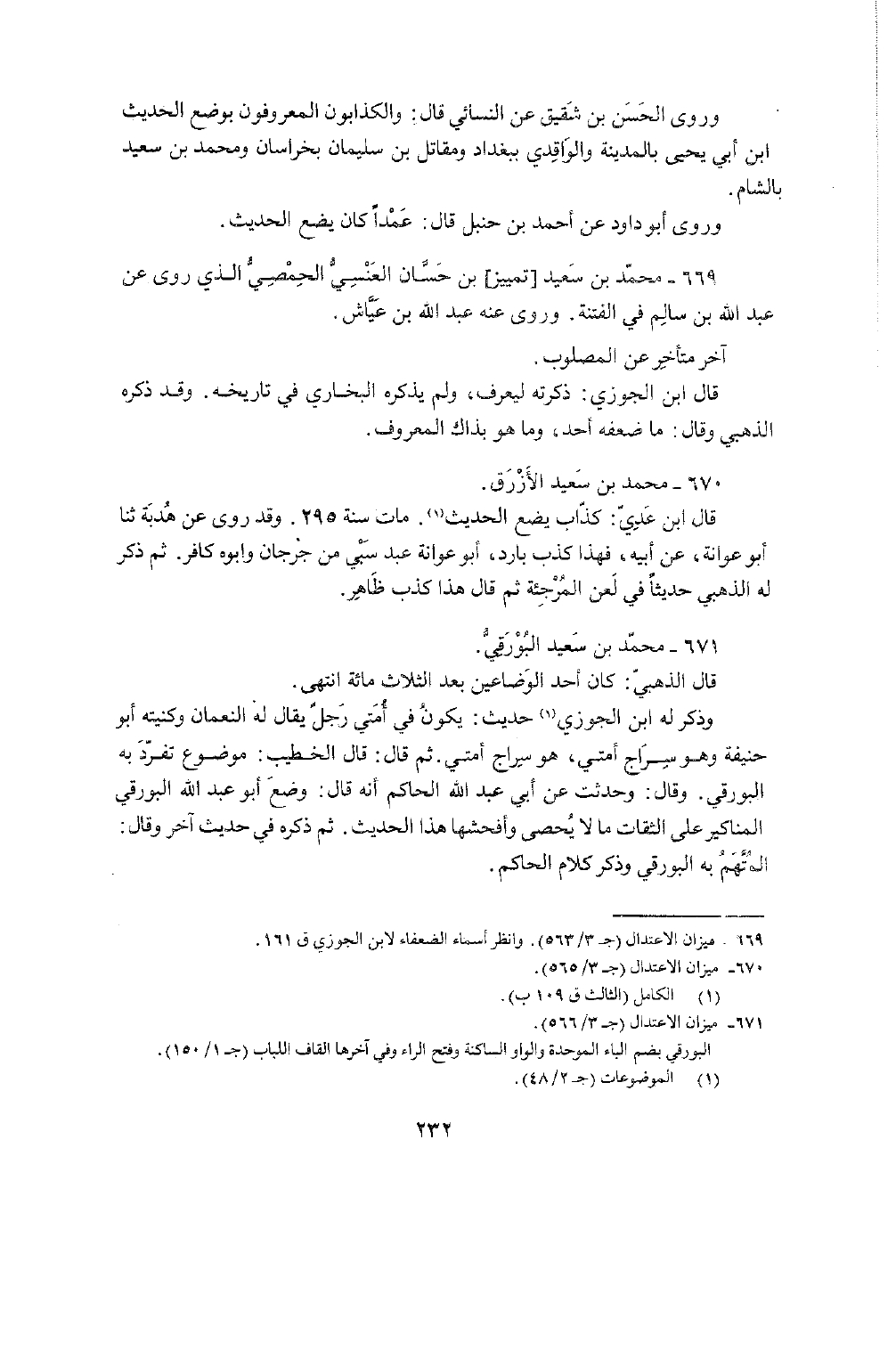 671 - مُحَمَّد بن سعيد البورقي قَالَ الذَّهَبِيّ كَانَ أحد الوضاعين بعد الثَّلَاث مائَة انْتهى وَذكر لَهُ أبي الْجَوْزِيّ حَدِيث يكون فِي أمتِي رجل يُقَال لَهُ النُّعْمَان وكنيته أَبُو حنيفَة وَهُوَ سراج أمتِي هُوَ سراج أمتِي ثمَّ قَالَ قَالَ الْخَطِيب مَوْضُوع تفرد بِهِ البورقي وَقَالَ وَحدثت عَن أبي عبد الله الْحَاكِم أَنه قَالَ وضع أَبُو عبد الله البورقي الْمَنَاكِير على الثِّقَات مَا لَا يُحْصى وأفحشها هَذَا الحَدِيث ثمَّ ذكره فِي حَدِيث آخر وَقَالَ الْمُتَّهم بِهِ البورقي وَذكر كَلَام الْحَاكِم