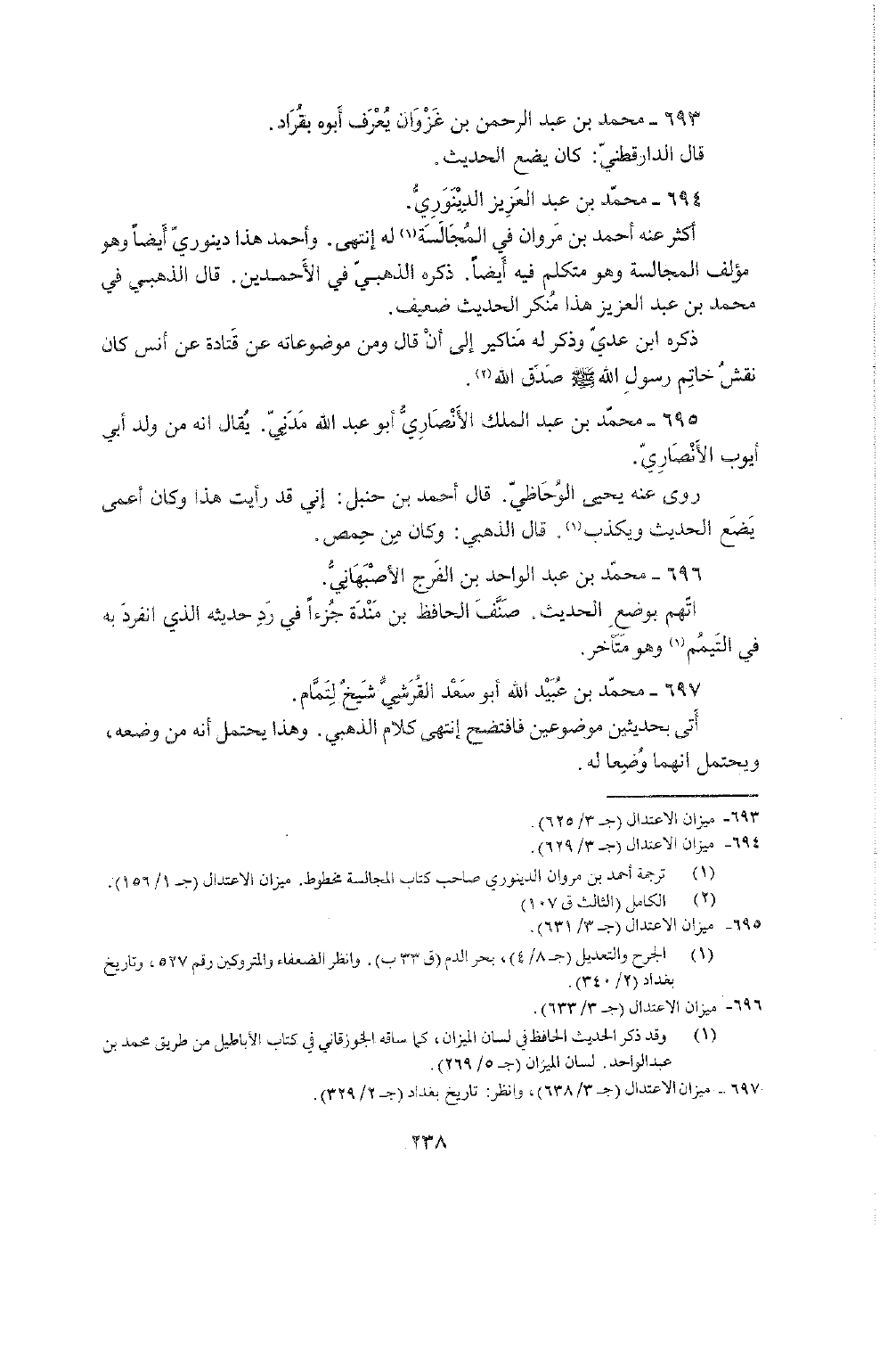 695 - مُحَمَّد بن عبد الْملك الْأنْصَارِيّ أَبُو عبد الله مدنِي يُقَال أَنه من ولد أبي أَيُّوب الْأنْصَارِيّ روى عَنهُ يحيى الوحاظي قَالَ أَحْمد بن حَنْبَل إِنِّي قد رَأَيْت هَذَا وَكَانَ أعمى يضع الحَدِيث ويكذب قَالَ الذَّهَبِيّ وَكَانَ من حمص