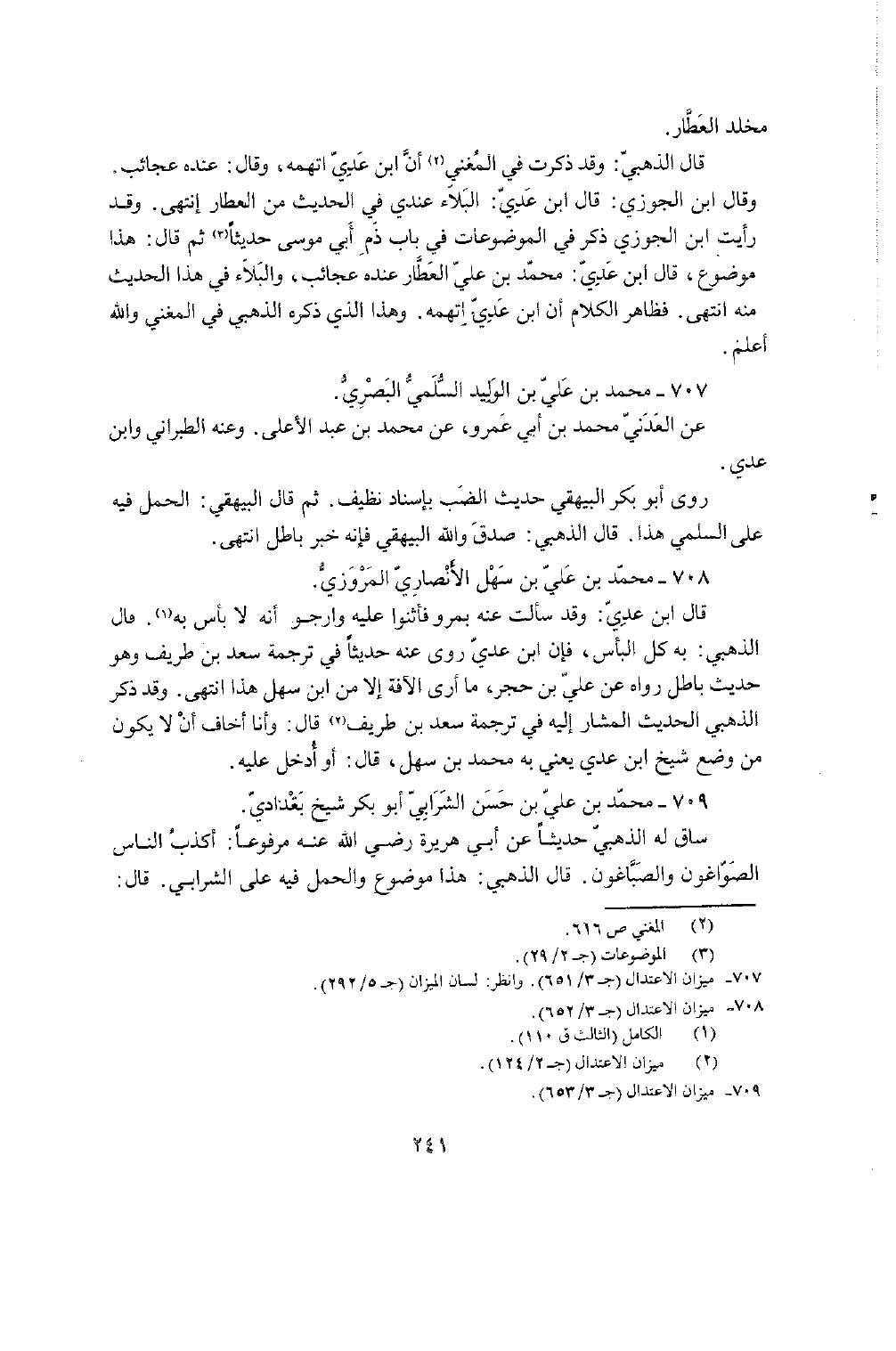 707 - مُحَمَّد بن عَليّ بن الْوَلِيد السّلمِيّ الْبَصْرِيّ عَن الْعَدنِي مُحَمَّد بن أبي عَمْرو عَن مُحَمَّد بن عبد الْأَعْلَى وَعنهُ الطَّبَرَانِيّ وَابْن عدي روى أَبُو بكر الْبَيْهَقِيّ حَدِيث الضَّب بِإِسْنَاد نظيف ثمَّ قَالَ الْبَيْهَقِيّ الْحمل فِيهِ على السّلمِيّ هَذَا صدق وَالله الْبَيْهَقِيّ فَإِنَّهُ خبر بَاطِل انْتهى