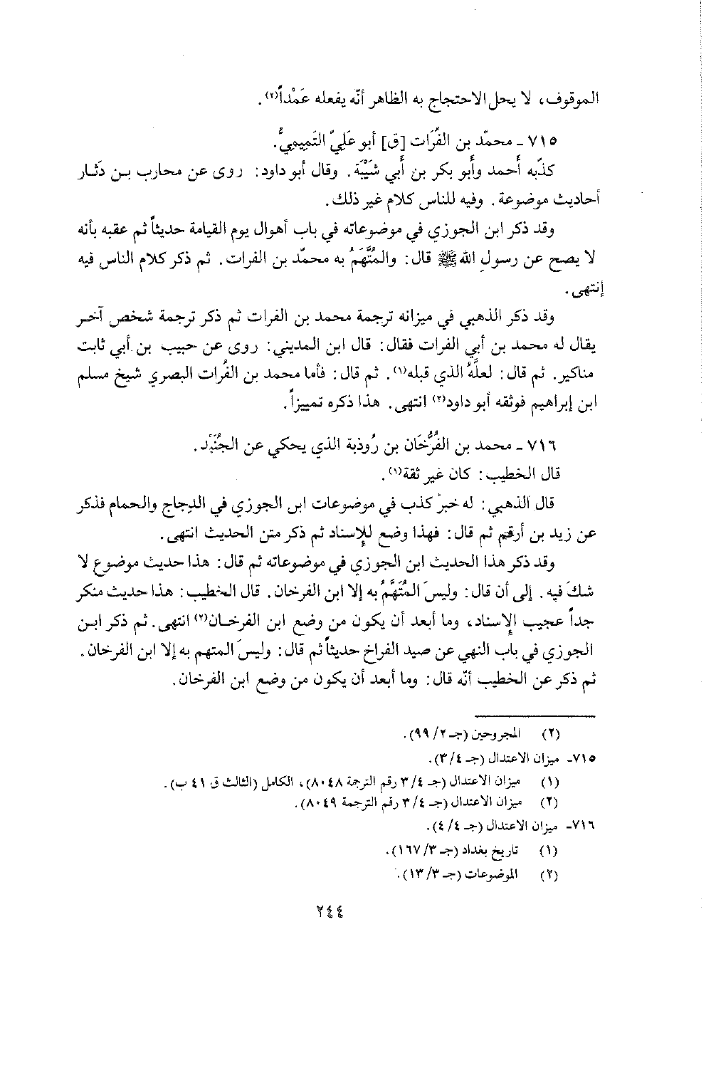 716 - مُحَمَّد بن الفرخان بن روذبة الَّذِي يَحْكِي عَن الْجُنَيْد قَالَ الْخَطِيب كَانَ غير ثِقَة قَالَ الذَّهَبِيّ لَهُ خبر كذب فِي مَوْضُوعَات بن الْجَوْزِيّ فِي الدَّجَاج وَالْحمام فَذكر عَن زيد بن أَرقم ثمَّ قَالَ فَهَذَا وضع للإسناد ثمَّ ذكر متن الحَدِيث انْتهى وَقد ذكر هَذَا الحَدِيث بن الْجَوْزِيّ فِي مَوْضُوعَاته ثمَّ قَالَ هَذَا حَدِيث مَوْضُوع لَا شكّ فِيهِ إِلَى أَن قَالَ وَلَيْسَ الْمُتَّهم بِهِ إِلَّا بن الفرخان قَالَ الْخَطِيب هَذَا حَدِيث مُنكر جدا عَجِيب الْإِسْنَاد وَمَا أبعد أَن يكون من وضع بن الفرخان انْتهى ثمَّ ذكر بن الْجَوْزِيّ فِي بَاب النَّهْي عَن صيد الْفِرَاخ حَدِيثا ثمَّ قَالَ وَلَيْسَ الْمُتَّهم بِهِ إِلَّا بن الفرخان ثمَّ ذكر عَن الْخَطِيب أَنه قَالَ وَمَا أبعد أَن يكون من وضع بن الفرخان
