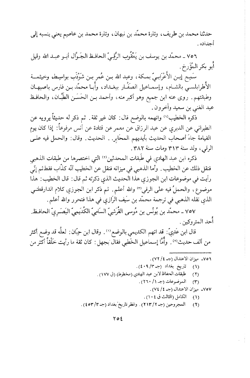 756 - مُحَمَّد بن يُوسُف بن يَعْقُوب الرقي الْحَافِظ الجوال أَبُو عبد الله وَقيل أَبُو بكر المؤرخ سمع بن الْأَعرَابِي بِمَكَّة وَعبد الله بن عمر بن شَوْذَب بواسط وخيثمة الأطرابلسي بِالشَّام وَإِسْمَاعِيل الصفار بِبَغْدَاد وَأَبا مُحَمَّد بن فَارس بأصبهان وطبقتهم روى عَنهُ بن جَمِيع وَهُوَ أكبر مِنْهُ وَأحمد بن الْحسن الطبان والحافظ عبد الْغَنِيّ بن سعيد وَآخَرُونَ ذكره الْخَطِيب واتهمه بِالْوَضْعِ قَالَ كَانَ غير ثِقَة ثمَّ ذكر لَهُ حَدِيثا يرويهِ عَن الطَّبَرَانِيّ عَن الدبرِي عَن عبد الرَّزَّاق عَن معمر عَن قَتَادَة عَن أنس مَرْفُوعا إِذا كَانَ يَوْم الْقِيَامَة جَاءَ أَصْحَاب الحَدِيث بِأَيْدِيهِم المحابر الحَدِيث وَقَالَ وَالْحمل فِيهِ على الرقي ولد سنة 313 وَمَات سنة 382 ذكره بن عبد الْهَادِي فِي طَبَقَات الْمُحدثين الَّتِي اختصرها من طَبَقَات الذَّهَبِيّ فَنقل ذَلِك عَن الْخَطِيب وَأما فِي مِيزَانه فَنقل عَن الْخَطِيب أَنه كَذَّاب فَقَط ثمَّ إِنِّي رَأَيْت فِي مَوْضُوعَات بن الْجَوْزِيّ هَذَا الحَدِيث الَّذِي ذكرته ثمَّ قَالَ قَالَ الْخَطِيب هَذَا مَوْضُوع وَالْحمل فِيهِ على الرقي وَالله أعلم ثمَّ ذكر بن الْجَوْزِيّ كَلَام الدَّارَقُطْنِيّ الَّذِي نَقله الذَّهَبِيّ فِي تَرْجَمَة مُحَمَّد بن سيف الرَّازِيّ فِي هَذَا فَتحَرَّر وَالله أعلم
