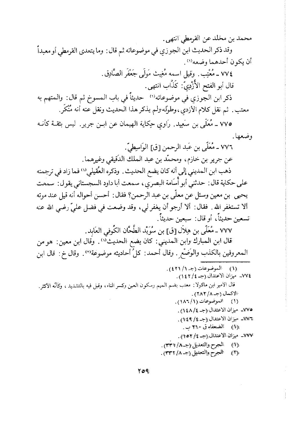 776 - مُعلى بن عبد الرَّحْمَن ق الوَاسِطِيّ عَن جرير بن خازم وَمُحَمّد بن عبد الْملك الدقيقي وَغَيرهمَا ذهب بن الْمَدِينِيّ إِلَى أَنه كَانَ يضع الحَدِيث وَذكره الْعقيلِيّ فَمَا زَاد فِي تَرْجَمته على حِكَايَة قَالَ حَدثنِي أَبُو أُسَامَة الْبَصْرِيّ سَمِعت أَبَا دَاوُد السجسْتانِي يَقُول سَمِعت يحيى بن معِين وَسُئِلَ عَن مُعلى بن عبد الرَّحْمَن فَقَالَ أحسن أَحْوَاله أَنه قيل عِنْد مَوته أَلا تستغفر الله فَقَالَ أَلا أَرْجُو أَن يغْفر لي وَقد وضعت فِي فضل عَليّ رَضِي الله عَنهُ تسعين حَدِيثا أَو قَالَ سبعين حَدِيثا