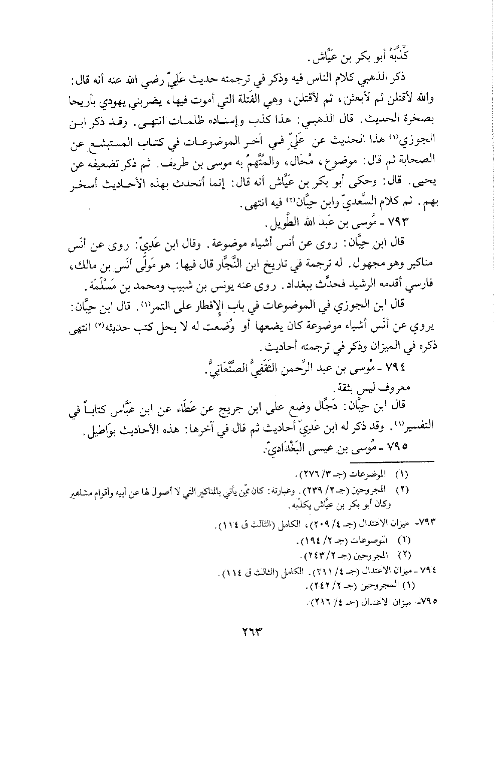 794 - مُوسَى بن عبد الرَّحْمَن الثَّقَفِيّ الصَّنْعَانِيّ مَعْرُوف لَيْسَ بِثِقَة قَالَ بن حبَان دجال وضع على بن جريج عَن عَطاء عَن بن عَبَّاس كتابا فِي التَّفْسِير وَقد ذكر لَهُ بن عدي أَحَادِيث ثمَّ قَالَ فِي آخرهَا هَذِه الْأَحَادِيث بَوَاطِيلُ