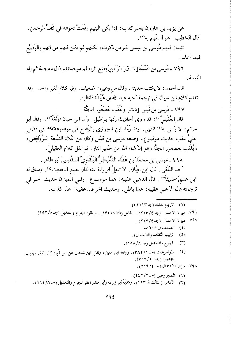 798 - مُوسَى بن مُحَمَّد بن عَطاء الدمياطي الْبُلْقَاوِيُّ الْمَقْدِسِي أَبُو طَاهِر أحد التلفى قَالَ بن حبَان لَا تحل الرِّوَايَة عَنهُ كَانَ يضع الحَدِيث وسَاق لَهُ بن عدي حَدِيثا قَالَ الذَّهَبِيّ عَقِيبه هَذَا مَوْضُوع وَفِي الْمِيزَان حَدِيث آخر فِي تَرْجَمته قَالَ الذَّهَبِيّ عَقِيبه هَذَا بَاطِل وَحَدِيث آخر قَالَ عَقِيبه هَذَا كذب