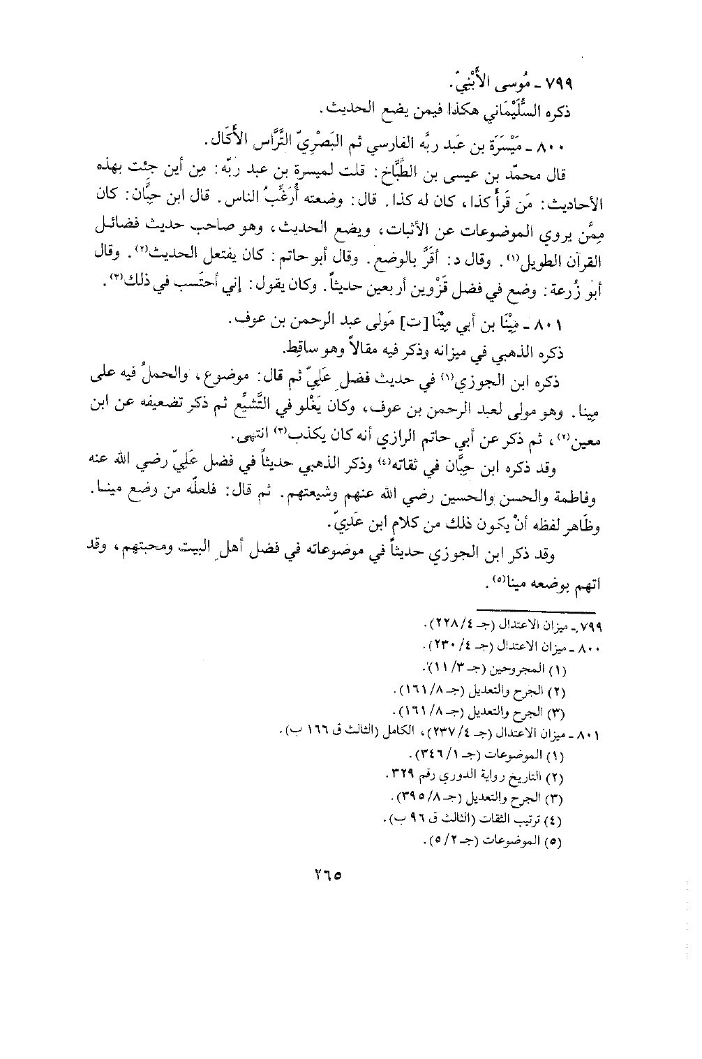 800 - ميسرَة بن عبد ربه الْفَارِسِي ثمَّ الْبَصْرِيّ التراس الأكال قَالَ مُحَمَّد بن عِيسَى بن الطباخ قلت لِميسرَة بن عبد ربه من أَيْن جِئْت بِهَذِهِ الْأَحَادِيث من قَرَأَ كَذَا كَانَ لَهُ كَذَا قَالَ وَضعته أَرغب النَّاس قَالَ بن حبَان كَانَ مِمَّن يروي الموضوعات عَن الْأَثْبَات وَيَضَع الحَدِيث وَهُوَ صَاحب حَدِيث فَضَائِل الْقُرْآن الطَّوِيل وَقَالَ د أقرّ بِالْوَضْعِ وَقَالَ أَبُو حَاتِم كَانَ يفتعل الحَدِيث وَقَالَ أَبُو زرْعَة وضع فِي فضل قزوين أَرْبَعِينَ حَدِيثا وَكَانَ يَقُول إِنِّي احتسب فِي ذَلِك