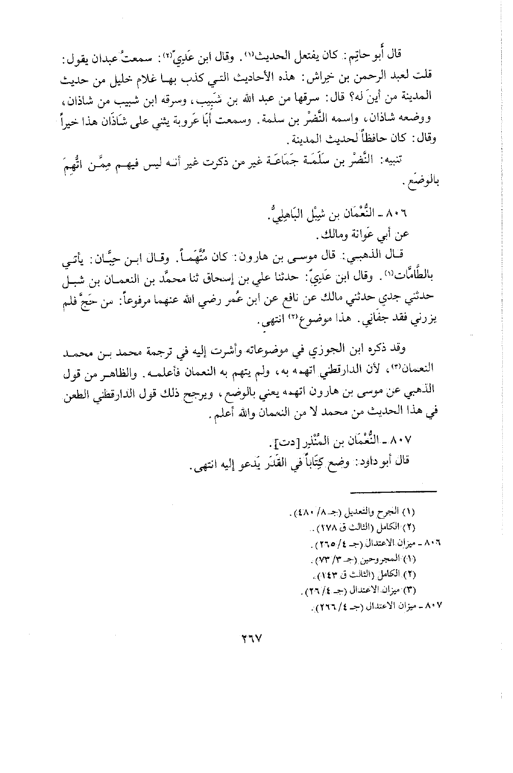 806 - النُّعْمَان بن شبْل الْبَاهِلِيّ عَن أبي عوَانَة وَمَالك قَالَ الذَّهَبِيّ قَالَ مُوسَى بن هَارُون كَانَ مُتَّهمًا وَقَالَ بن حبَان يَأْتِي بالطامات وَقَالَ بن عدي حَدثنَا عَليّ بن إِسْحَاق ثَنَا مُحَمَّد بن النُّعْمَان بن شبْل حَدثنِي جدي حَدثنِي مَالك عَن نَافِع عَن بن عمر رَضِي الله عَنْهُمَا مَرْفُوعا من حج فَلم يزرني فقد جفاني هَذَا مَوْضُوع انْتهى وَقد ذكره بن الْجَوْزِيّ فِي مَوْضُوعَاته وأشرت إِلَيْهِ فِي تَرْجَمَة مُحَمَّد بن مُحَمَّد النُّعْمَان لِأَن الدَّارَقُطْنِيّ أَتَّهِمهُ بِهِ وَلم يتهم بِهِ النُّعْمَان فَأعلمهُ وَالظَّاهِر من قَول الذَّهَبِيّ عَن مُوسَى بن هَارُون أَتَّهِمهُ يَعْنِي بِالْوَضْعِ ويرجح ذَلِك قَول الدَّارَقُطْنِيّ الطعْن فِي هَذَا الحَدِيث من مُحَمَّد لَا من النُّعْمَان وَالله أعلم