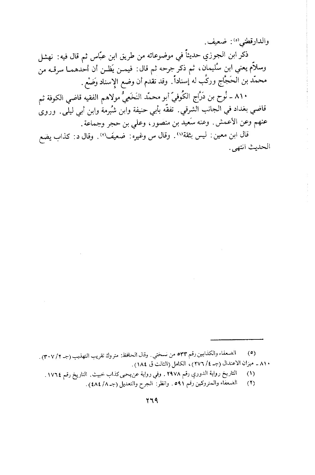 810 - نوح بن دراج الْكُوفِي أَبُو مُحَمَّد النَّخعِيّ مَوْلَاهُم الْفَقِيه قَاضِي الْكُوفَة ثمَّ قَاضِي بَغْدَاد فِي الْجَانِب الشَّرْقِي تفقه بِأبي حنيفَة وَابْن شبْرمَة وَابْن أبي ليلى وروى عَنْهُم وَعَن الْأَعْمَش وَعنهُ سعيد بن مَنْصُور وَعلي بن حجر وَجَمَاعَة قَالَ بن معِين لَيْسَ بِثِقَة وَقَالَ س وَغَيره ضَعِيف وَقَالَ د كَذَّاب يضع الحَدِيث انْتهى
