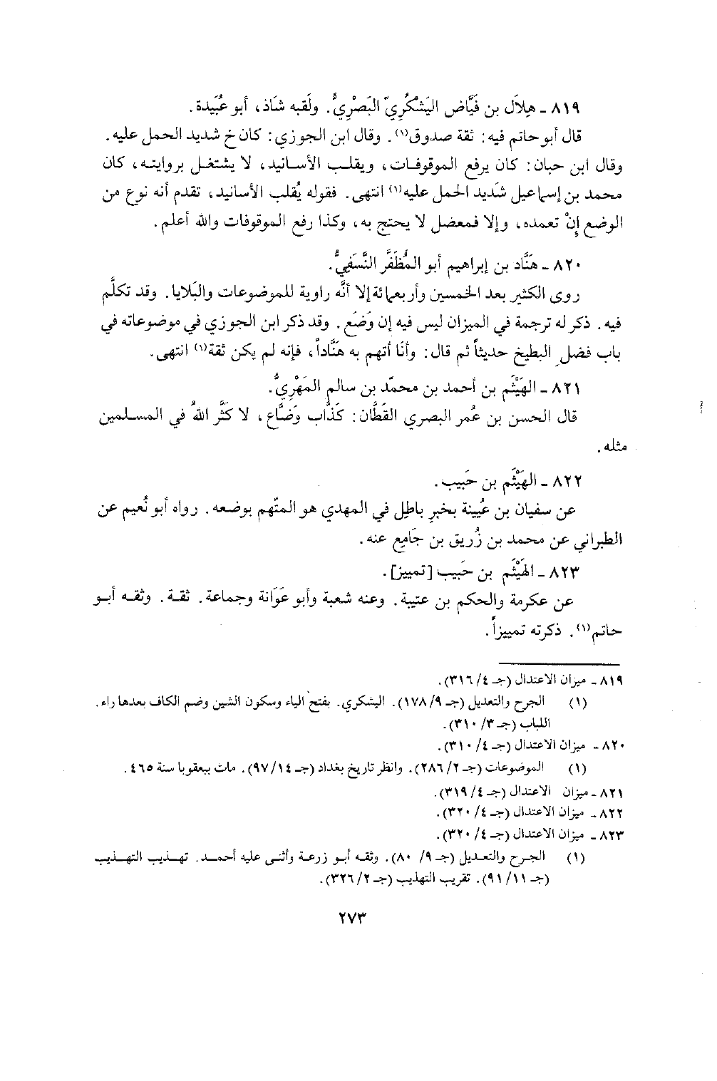 819 - هِلَال بن فياض الْيَشْكُرِي الْبَصْرِيّ ولقبه شَاذ أَبُو عُبَيْدَة قَالَ أَبُو حَاتِم فِيهِ ثِقَة صَدُوق وَقَالَ بن الْجَوْزِيّ كَانَ خَ شَدِيد الْحمل عَلَيْهِ وَقَالَ بن حبَان كَانَ يرفع الْمَوْقُوفَات ويقلب الْأَسَانِيد لَا يشْتَغل بروايته كَانَ مُحَمَّد بن إِسْمَاعِيل شَدِيد الْحمل عَلَيْهِ انْتهى فَقَوله يقلب الْأَسَانِيد تقدم أَنه نوع من الْوَضع إِن تَعَمّده وَإِلَّا فمعضل لَا يحْتَج بِهِ وَكَذَا وَرفع الْمَوْقُوفَات وَالله أعلم