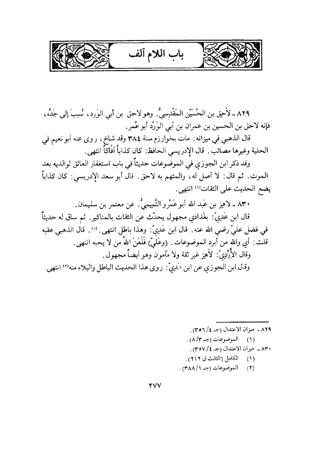 829 - لَاحق بن الْحُسَيْن الْمَقْدِسِي وَهُوَ لَاحق بن أبي الْورْد نسب إِلَى جده فَإِنَّهُ لَاحق بن الْحُسَيْن بن عمرَان بن أبي الْورْد أَبُو عمر قَالَ الذَّهَبِيّ فِي مِيزَانه مَاتَ بخوارزم سنة 384 وَقد شاخ روى عَنهُ أَبُو نعيم فِي الْحِلْية وَغَيرهَا مصائب قَالَ الإدريسي الْحَافِظ كَانَ كذابا أفاكا انْتهى وَقد ذكر بن الْجَوْزِيّ فِي الموضوعات حَدِيثا فِي بَاب اسْتِغْفَار العائق لوَالِديهِ بعد الْمَوْت ثمَّ قَالَ لَا أصل لَهُ وَالْمُتَّهَم بِهِ لَاحق قَالَ أَبُو سعد الإدريسي كَانَ كذابا يضع الحَدِيث على الثِّقَات انْتهى