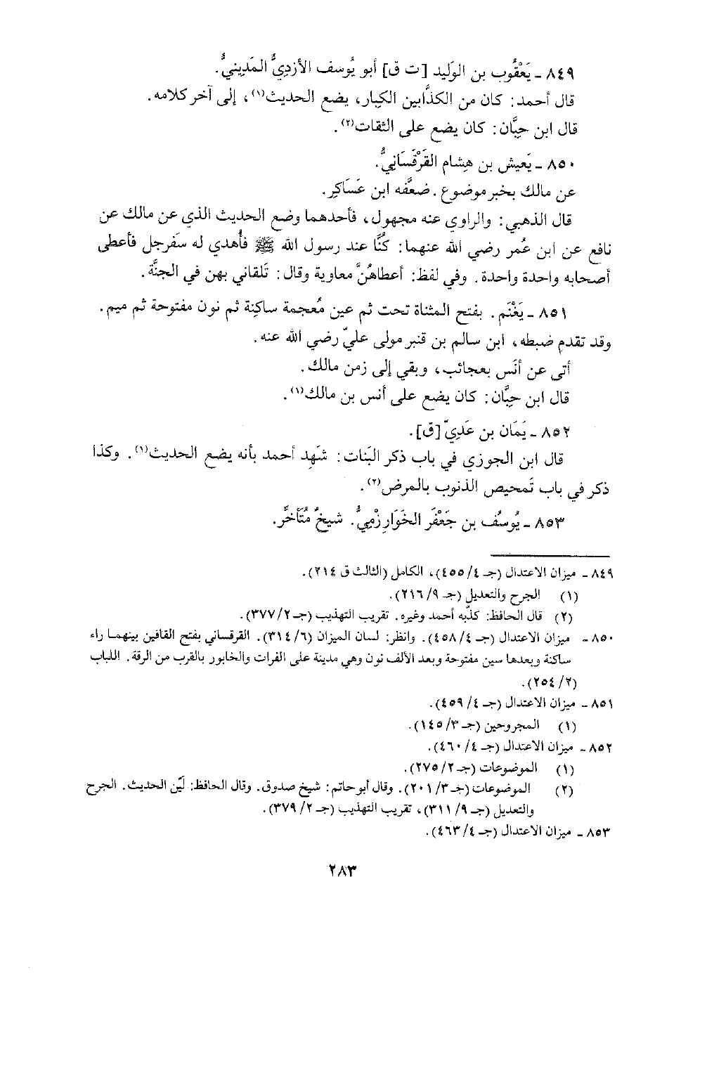 853 - يُوسُف بن جَعْفَر الْخَوَارِزْمِيّ شيخ مُتَأَخّر قَالَ أَبُو سعيد النقاش كَانَ يضع الحَدِيث وَذكر بن الْجَوْزِيّ أَن هَذَا من وَضعه لما عرج بِي إِلَى السَّمَاء قلت اللَّهُمَّ اجْعَل الْخَلِيفَة من بعدِي عليا قَالَ فارتجت السَّمَاوَات وهتفت بِي الْمَلَائِكَة اقرؤا وَمَا تشاءون إِلَّا أَن يَشَاء الله وَقد شَاءَ الله أَبَا بكر