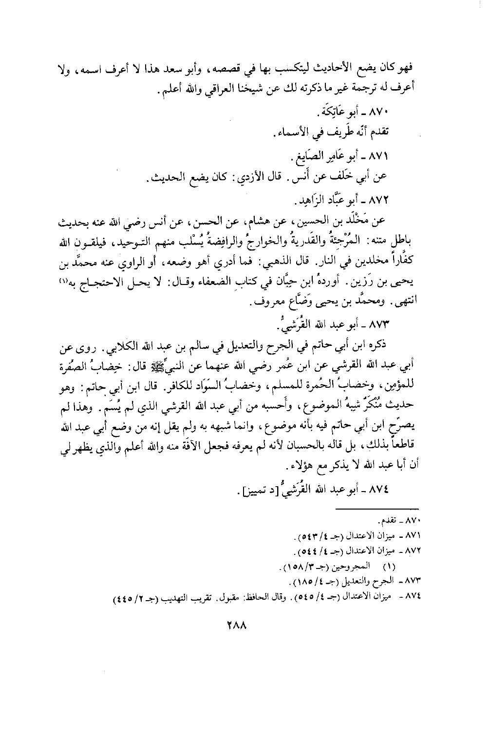 872 - أَبُو عباد الزَّاهِد عَن مخلد بن الْحُسَيْن عَن هِشَام عَن الْحسن عَن أنس رَضِي الله عَنهُ بِحَدِيث بَاطِل مَتنه المرجئة والقدرية والخوارج والرافضة يسلب مِنْهُم التَّوْحِيد فيلقون الله كفَّارًا مخلدين فِي النَّار قَالَ الذَّهَبِيّ فَمَا أَدْرِي أهوَ وَضعه أَو الرَّاوِي عَنهُ مُحَمَّد بن يحيى بن رزين أوردهُ بن حبَان فِي كتاب الضُّعَفَاء وَقَالَ لَا يحل الِاحْتِجَاج بِهِ انْتهى وَمُحَمّد بن يحيى وَضاع مَعْرُوف