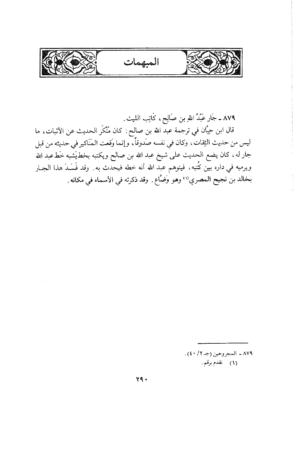 879 - جَار عبد الله بن صَالح كَاتب اللَّيْث قَالَ بن حبَان فِي تَرْجَمَة عبد الله بن صَالح كَانَ مُنكر الحَدِيث عَن الْأَثْبَات مَا لَيْسَ من حَدِيث الثِّقَات وَكَانَ فِي نَفسه صَدُوقًا وَإِنَّمَا وَقعت الْمَنَاكِير فِي حَدِيثه من قبل جَار لَهُ كَانَ يضع الحَدِيث على شيخ عبد الله بن صَالح ويكتبه بِخَط يشبه خطّ عبد الله ويرميه فِي دَاره بَين كتبه فيتوهم عبد الله أَنه خطه فَيحدث بِهِ وَقد فسد هَذَا الْجَار بِخَالِد بن نجيح الْمصْرِيّ وَهُوَ وَضاع وَقد ذكرته فِي الْأَسْمَاء فِي مَكَانَهُ