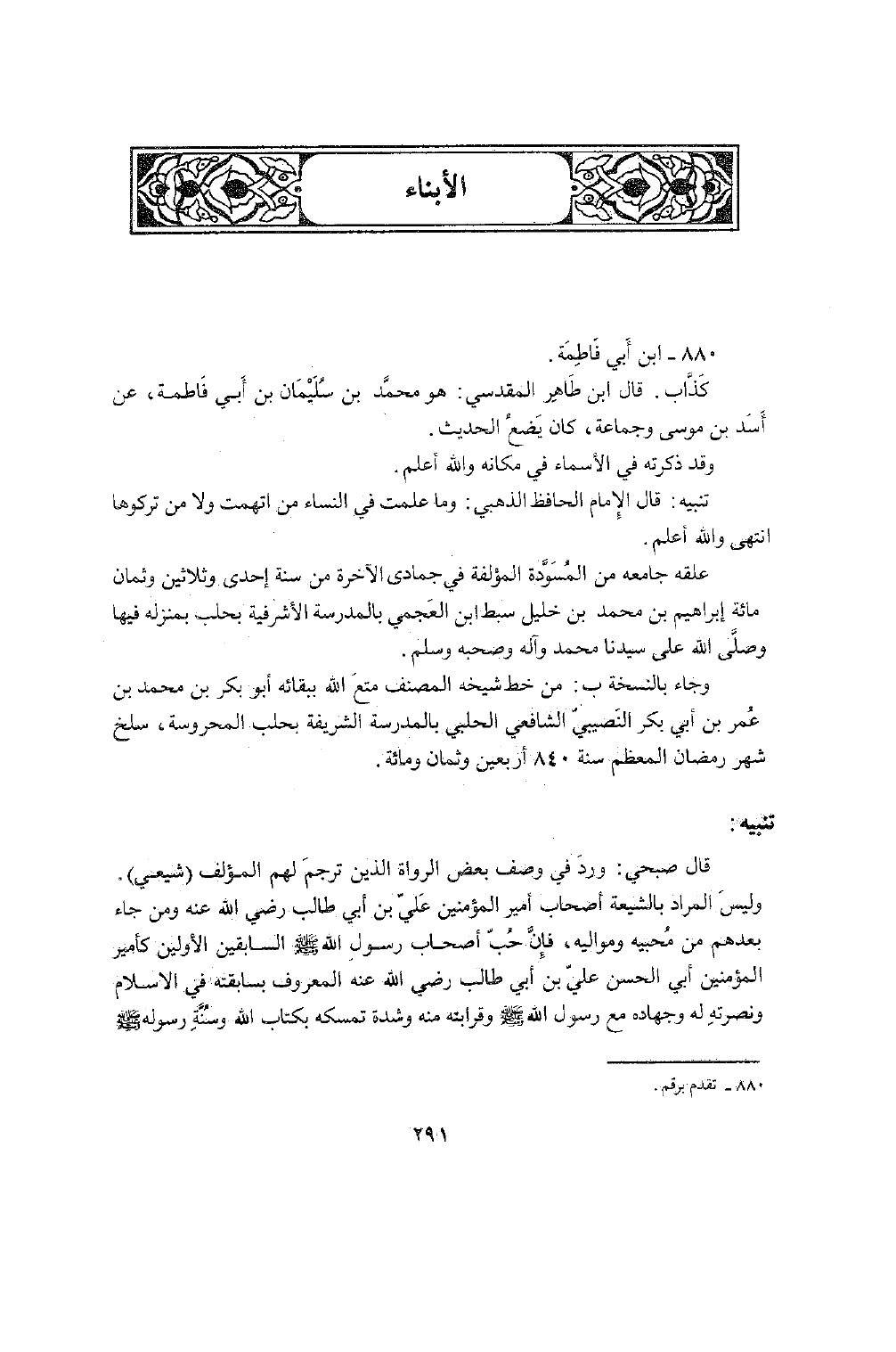 880 - بن أبي فَاطِمَة كَذَّاب قَالَ بن طَاهِر الْمَقْدِسِي هُوَ مُحَمَّد بن سُلَيْمَان بن أبي فَاطِمَة عَن أَسد بن مُوسَى وَجَمَاعَة كَانَ يضع الحَدِيث وَقد ذكرته فِي الْأَسْمَاء فِي مَكَانَهُ وَالله أعلم تَنْبِيه قَالَ الإِمَام الْحَافِظ الذَّهَبِيّ وَمَا علمت فِي النِّسَاء من اتهمت وَلَا من تركوها انْتهى وَالله أعلم