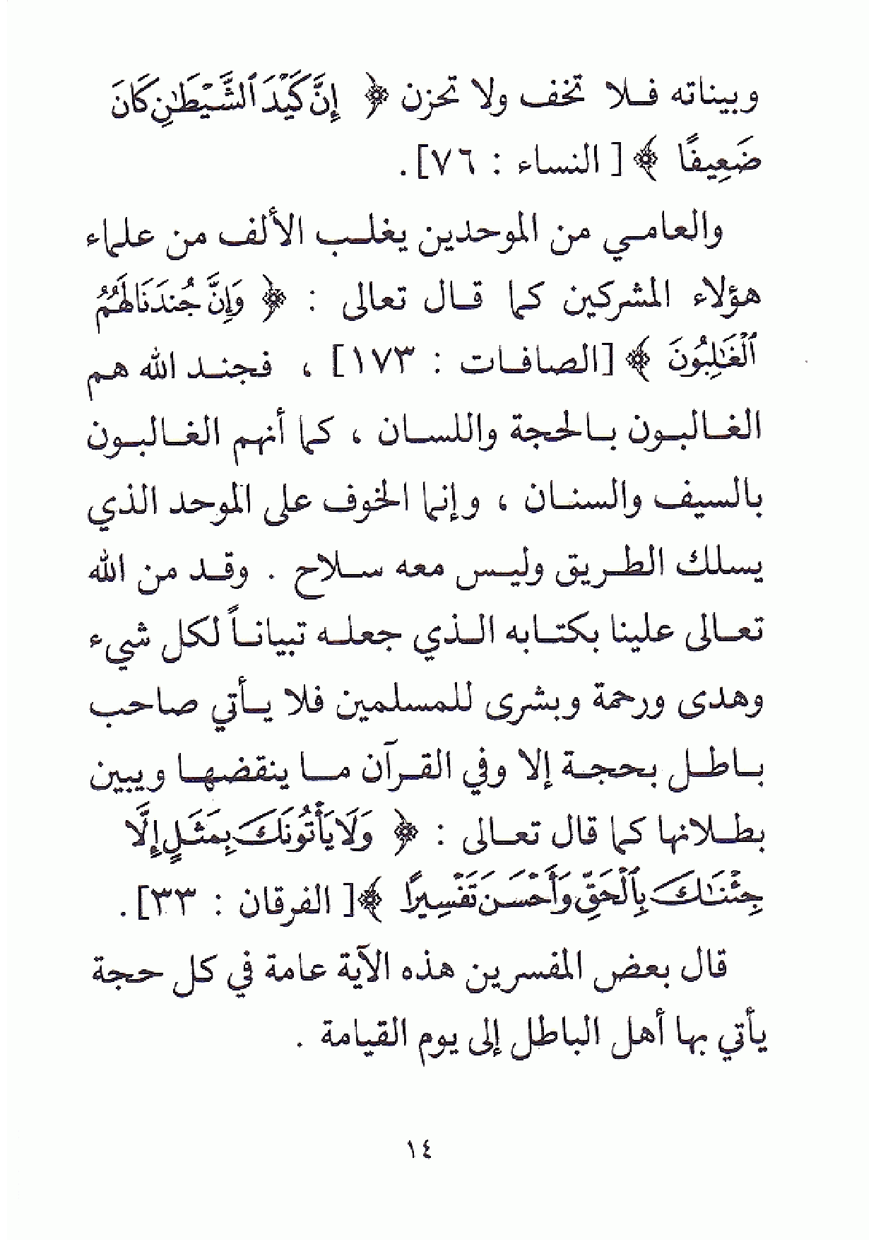 وبيناته فلا تخف ولا تحزن {إِنَّ كَيْدَ الشَّيْطَانِ كَانَ ضَعِيفًا} [النساء: 76] والعامي من الموحدين يغلب الألف من علماء هؤلاء المشركين كما قال تعالى: {وَإِنَّ جُنْدَنَا لَهُمُ الْغَالِبُونَ} [الصافات: 173] فجند الله هم الغالبون بالحجة واللسان، كما أنهم الغالبون بالسيف والسنان، وإنما الخوف على الموحد الذي يسلك الطريق وليس معه سلاح. وقد من الله تعالى علينا بكتابه الذي جعله تبيانا لكل شيء وهدى ورحمة وبشرى للمسلمين فلا يأتي صاحب باطل بحجة إلا وفي القرآن ما ينقضها ويبين بطلانها كما قال تعالى: {وَلَا يَأْتُونَكَ بِمَثَلٍ إِلَّا جِئْنَاكَ بِالْحَقِّ وَأَحْسَنَ تَفْسِيرًا} [الفرقان: 33] قال بعض المفسرين هذه الآية عامة في كل حجة يأتي بها أهل الباطل إلى يوم القيامة.
