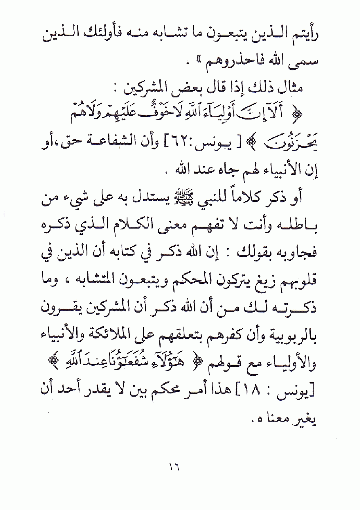 رأيتم الذين يتبعون ما تشابه منه فأولئك الذين سمى الله فاحذروهم» . مثال ذلك إذا قال بعض المشركين: {أَلَا إِنَّ أَوْلِيَاءَ اللَّهِ لَا خَوْفٌ عَلَيْهِمْ وَلَا هُمْ يَحْزَنُونَ} [يونس: 62] وأن الشفاعة حق، أو أن الأنبياء لهم جاه عند الله. أو ذكر كلاما للنبي - صلى الله عليه وسلم - يستدل به على شيء من باطله وأنت لا تفهم معنى الكلام الذي ذكره فجاوبه بقولك: إن الله ذكر في كتابه أن الذين في قلوبهم زيغ يتركون المحكم ويتبعون المتشابه، وما ذكرته لك من أن الله ذكر أن المشركين يقرون بالربوبية وأن كفرهم بتعلقهم على الملائكة والأنبياء والأولياء مع قولهم {هَؤُلَاءِ شُفَعَاؤُنَا عِنْدَ اللَّهِ} [يونس: 18] هذا أمر محكم بين لا يقدر أحد أن يغير معناه.