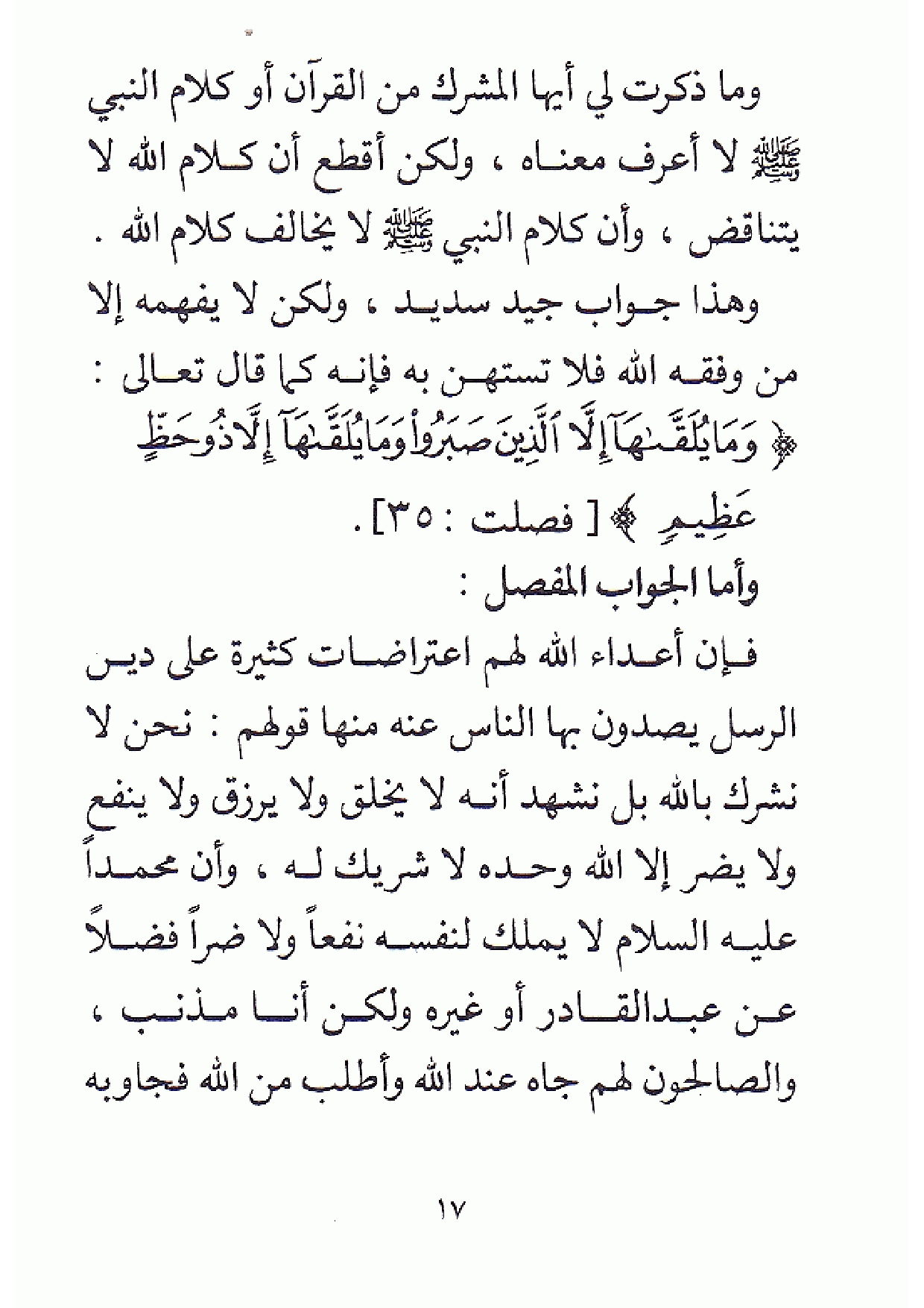 وما ذكرت لي أيها المشرك من القرآن أو كلام النبي - صلى الله عليه وسلم - لا أعرف معناه، ولكن أقطع أن كلام الله لا يتناقض، وأن كلام النبي - صلى الله عليه وسلم - لا يخالف كلام الله. وهذا جواب جيد سديد، ولكن لا يفهمه إلا من وفقه الله فلا تستهن به فإنه كما قال تعالى: {وَمَا يُلَقَّاهَا إِلَّا الَّذِينَ صَبَرُوا وَمَا يُلَقَّاهَا إِلَّا ذُو حَظٍّ عَظِيمٍ} [فصلت: 35] وأما الجواب المفصل: فإن أعداء الله لهم اعتراضات كثيرة على دين الرسل يصدون بها الناس عنه منها قولهم: نحن لا نشرك بالله بل نشهد أنه لا يخلق ولا يرزق ولا ينفع ولا يضر إلا الله وحده لا شريك له، وأن محمدا - عليه السلام - لا يملك لنفسه نفعا ولا ضرا فضلا عن عبد القادر أو غيره ولكن أنا مذنب، والصالحون لهم جاه عند الله وأطلب من الله فجاوبه