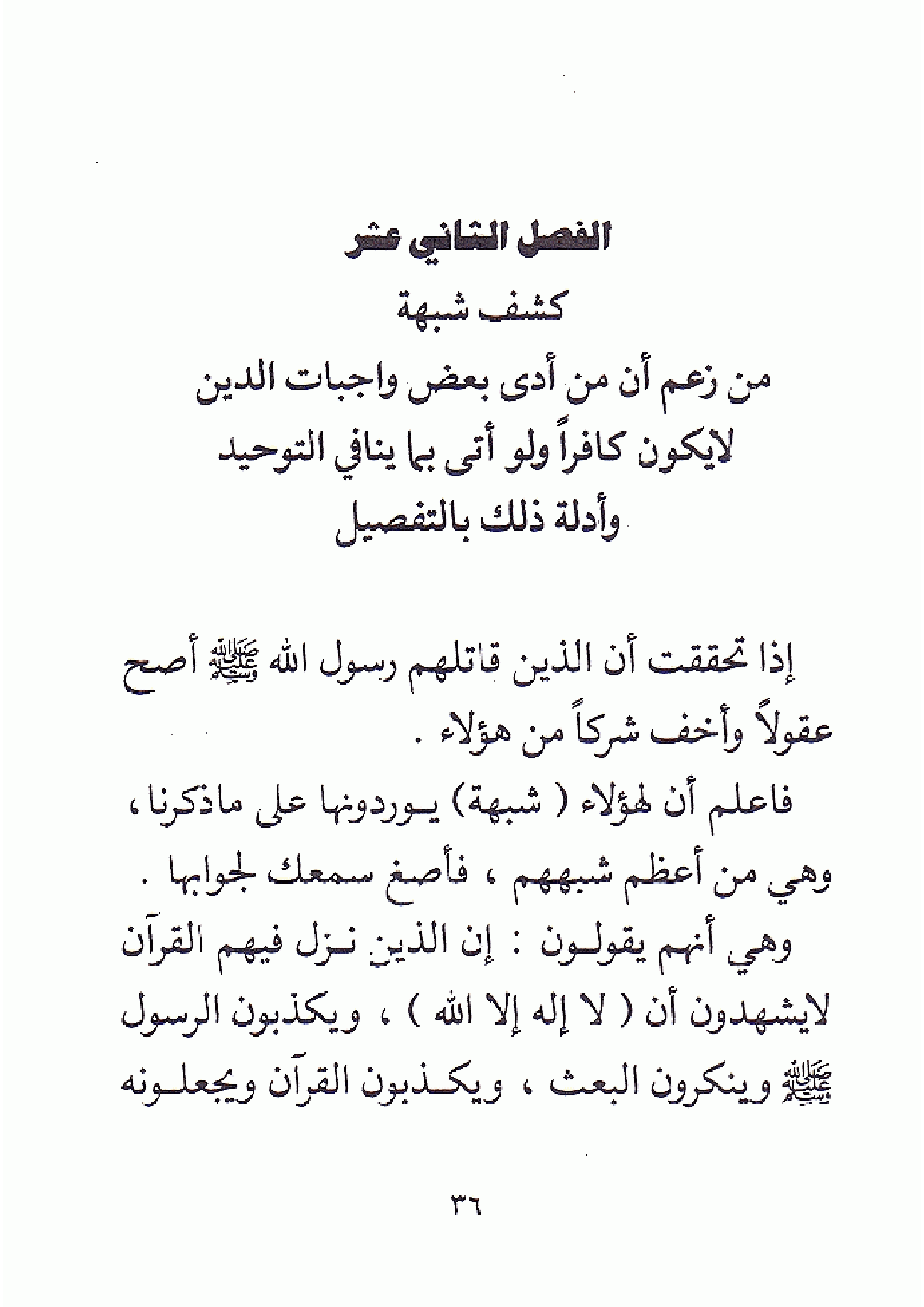 لا يكون كافرا ولو أتى بما ينافي التوحيد وأدلة ذلك بالتفصيل إذا تحققت أن الذين قاتلهم رسول الله - صلى الله عليه وسلم - أصح عقولا وأخف شركا من هؤلاء. فاعلم أن لهؤلاء (شبهة) يوردونها على ما ذكرنا، وهي من أعظم شبههم، فأصغ سمعك لجوابها. وهي أنهم يقولون: إن الذين نزل فيهم القرآن لا يشهدون أن (لا إله إلا الله) ، ويكذبون الرسول - صلى الله عليه وسلم - وينكرون البعث، ويكذبون القرآن ويجعلونه