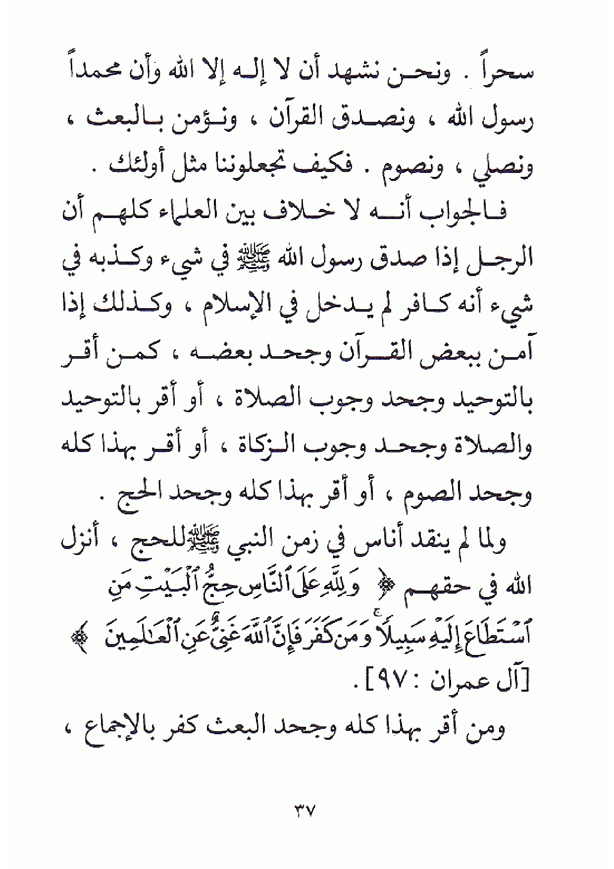 سحرا. ونحن نشهد أن لا إله إلا الله وأن محمدا رسول الله، ونصدق القرآن، ونؤمن بالبعث، ونصلي، ونصوم. فكيف تجعلوننا مثل أولئك. فالجواب أنه لا خلاف بين العلماء كلهم أن الرجل إذا صدق رسول الله - صلى الله عليه وسلم - في شيء وكذبه في شيء أنه كافر لم يدخل في الإسلام، وكذلك إذا آمن ببعض القرآن وجحد بعضه، كمن أقر بالتوحيد وجحد وجوب الصلاة، أو أقر بالتوحيد والصلاة وجحد وجوب الزكاة، أو أقر بهذا كله وجحد الصوم، أو أقر بهذا كله وجحد الحج. ولما لم ينقد أناس في زمن النبي - صلى الله عليه وسلم - للحج، أنزل الله في حقهم {وَلِلَّهِ عَلَى النَّاسِ حِجُّ الْبَيْتِ مَنِ اسْتَطَاعَ إِلَيْهِ سَبِيلًا وَمَنْ كَفَرَ فَإِنَّ اللَّهَ غَنِيٌّ عَنِ الْعَالَمِينَ} [آل عمران: 97] ومن أقر بهذا كله وجحد البعث كفر بالإجماع،