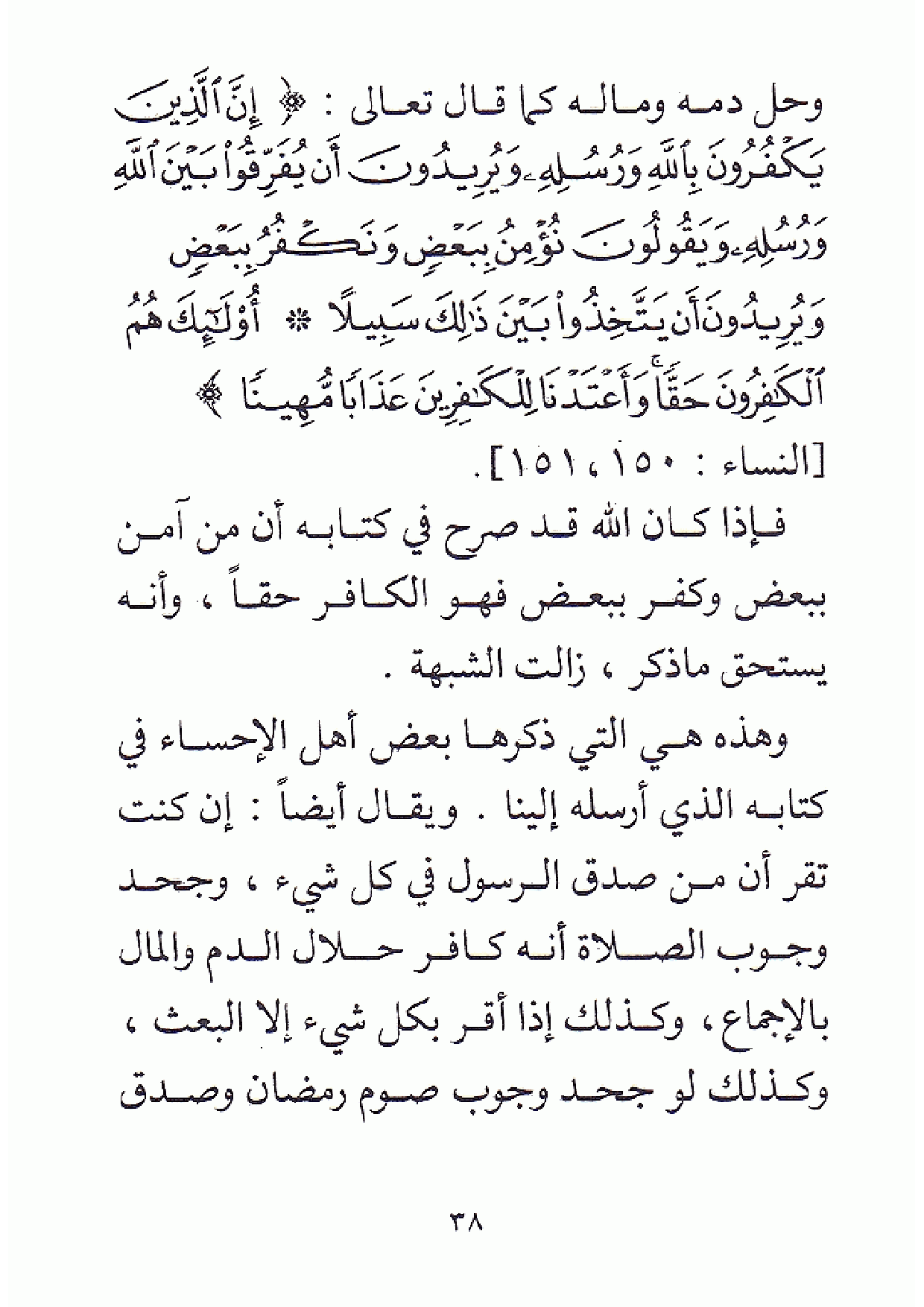وحل دمه وماله كما قال تعالى: {إِنَّ الَّذِينَ يَكْفُرُونَ بِاللَّهِ وَرُسُلِهِ وَيُرِيدُونَ أَنْ يُفَرِّقُوا بَيْنَ اللَّهِ وَرُسُلِهِ وَيَقُولُونَ نُؤْمِنُ بِبَعْضٍ وَنَكْفُرُ بِبَعْضٍ وَيُرِيدُونَ أَنْ يَتَّخِذُوا بَيْنَ ذَلِكَ سَبِيلًا - أُولَئِكَ هُمُ الْكَافِرُونَ حَقًّا وَأَعْتَدْنَا لِلْكَافِرِينَ عَذَابًا مُهِينًا} [النساء: 150 - 151] فإذا كان الله قد صرح في كتابه أن من آمن ببعض وكفر ببعض فهو الكافر حقا، وأنه يستحق ما ذكر، زالت الشبهة. وهذه هي التي ذكرها بعض أهل الإحساء في كتابه الذي أرسله إلينا. ويقال أيضا: إن كنت تقر أن من صدق الرسول في كل شيء، وجحد وجوب الصلاة أنه كافر حلال الدم والمال بالإجماع، وكذلك إذا أقر بكل شيء إلا البعث، وكذلك لو جحد وجوب صوم رمضان وصدق