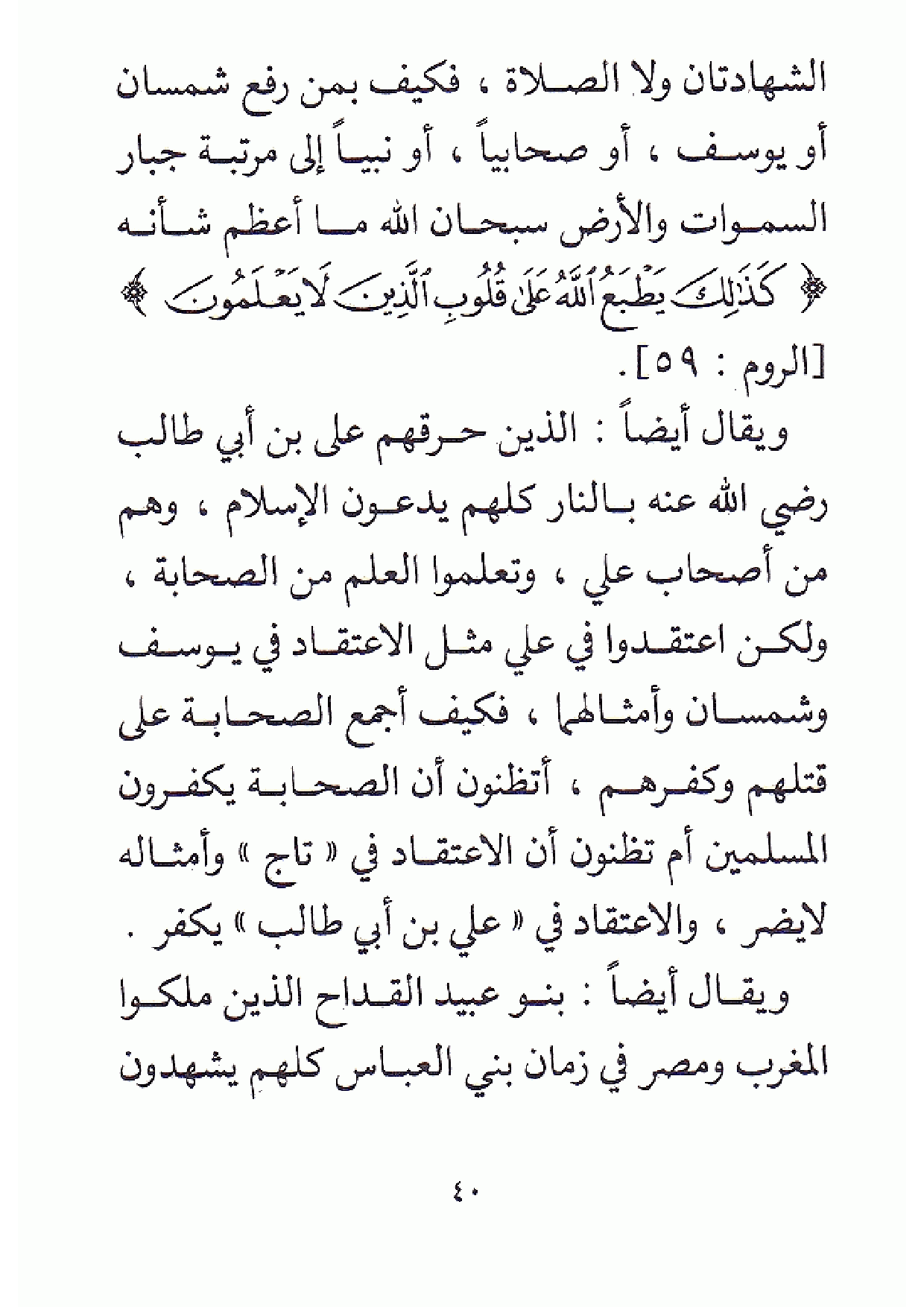 الشهادتان ولا الصلاة، فكيف بمن رفع شمسان أو يوسف، أو صحابيَاَ، أو نبيا إلى مرتبة جبار السماوات والأرض سبحان الله ما اعظم شأنه {كَذَلِكَ يَطْبَعُ اللَّهُ عَلَى قُلُوبِ الَّذِينَ لَا يَعْلَمُونَ} [الروم: 59] ويقال أيضا: الذين حرقهم علي بن أبي طالب - رضي الله عنه - بالنار كلهم يدعون الإسلام، وهم من أصحاب علي، وتعلموا العلم من الصحابة، ولكن اعتقدوا في علي مثل الاعتقاد في يوسف وشمسان وأمثالهما، فكيف أجمع الصحابة على قتلهم وكفرهم، أتظنون أن الصحابة يكفرون المسلمين أم تظنون أن الاعتقاد في " تاج " وأمثاله لا يضر، والاعتقاد في " علي بن أبي طالب " يكفر. ويقال أيضا: بنو عبيد القداح الذين ملكوا المغرب ومصر في زمان بني العباس كلهم يشهدون