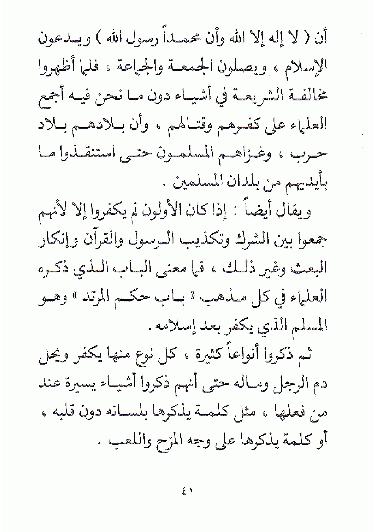 أن (لا إله إلا الله وأن محمدا رسول الله) ويدعون الإسلام، ويصلون الجمعة والجماعة، فلما أظهروا مخالفة الشريعة في أشياء دون ما نحن فيه أجمع العلماء على كفرهم وقتالهم، وأن بلادهم بلاد حرب، وغزاهم المسلمون حتى استنقذوا ما بأيديهم من بلدان المسلمين. ويقال أيضا: إذا كان الأولون لم يكفروا إلا لأنهم جمعوا بين الشرك وتكذيب الرسول والقرآن وإنكار البعث وغير ذلك، فما معنى الباب الذي ذكره العلماء في كل مذهب " باب حكم المرتد " وهو المسلم الذي يكفر بعد إسلامه. ثم ذكروا أنواعا كثيرة، كل نوع منها يكفر ويحل دم الرجل وماله حتى أنهم ذكروا أشياء يسيرة عند من فعلها، مثل كلمة يذكرها بلسانه دون قلبه، أو كلمة يذكرها على وجه المزح واللعب.