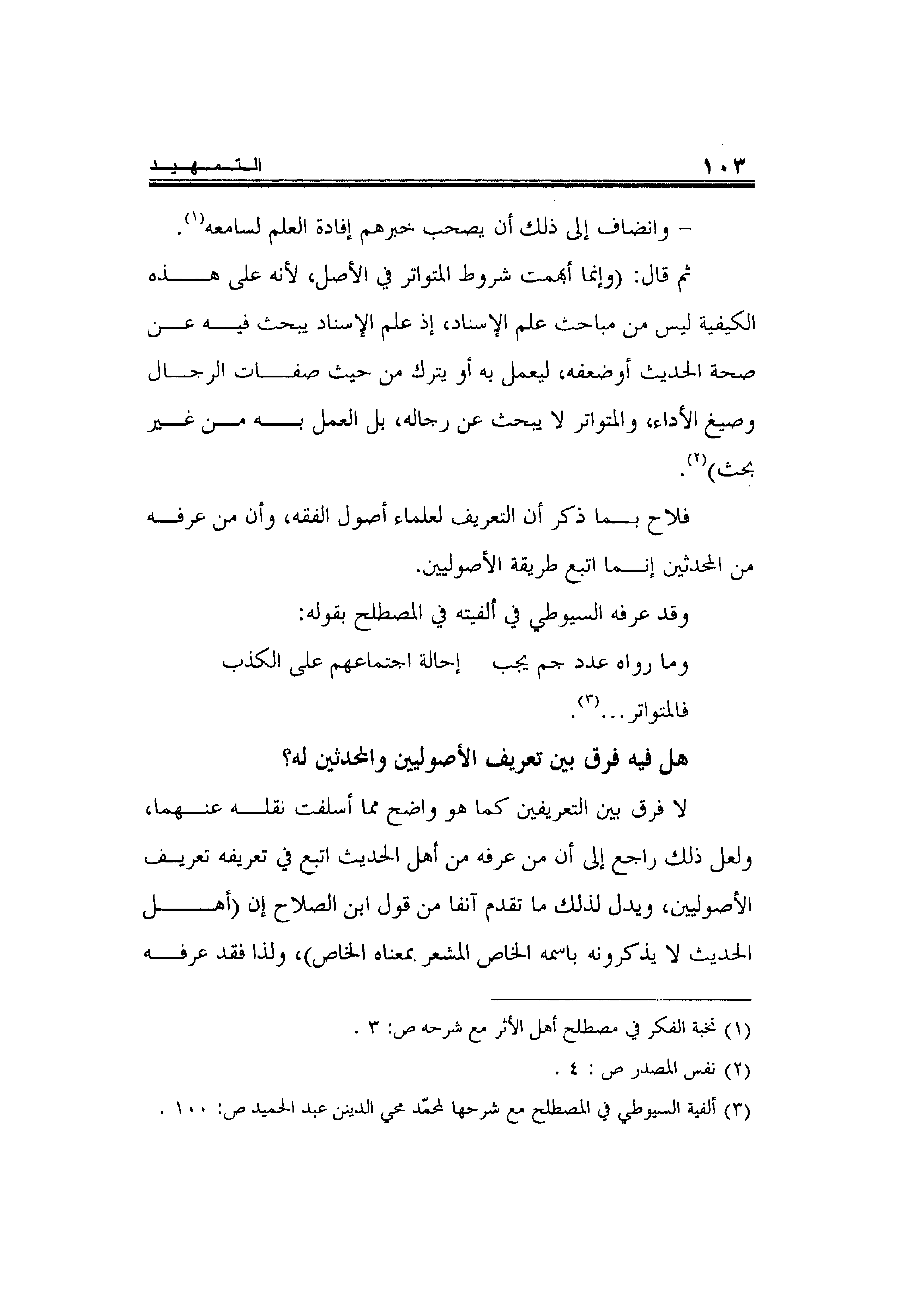 ثم قال: "وإنما أبهمت شروط المتواتر في الأصل، لأنه على هذه الكيفية ليس من مباحث علم الإسناد، إذ علم الإسناد يبحث فيه عن صحة الحديث أوضعفه، ليعمل به أو يترك من حيث صفات الرجال وصيغ الأداء، والمتواتر لا يبحث عن رجاله، بل العمل به من غير بحث"2.