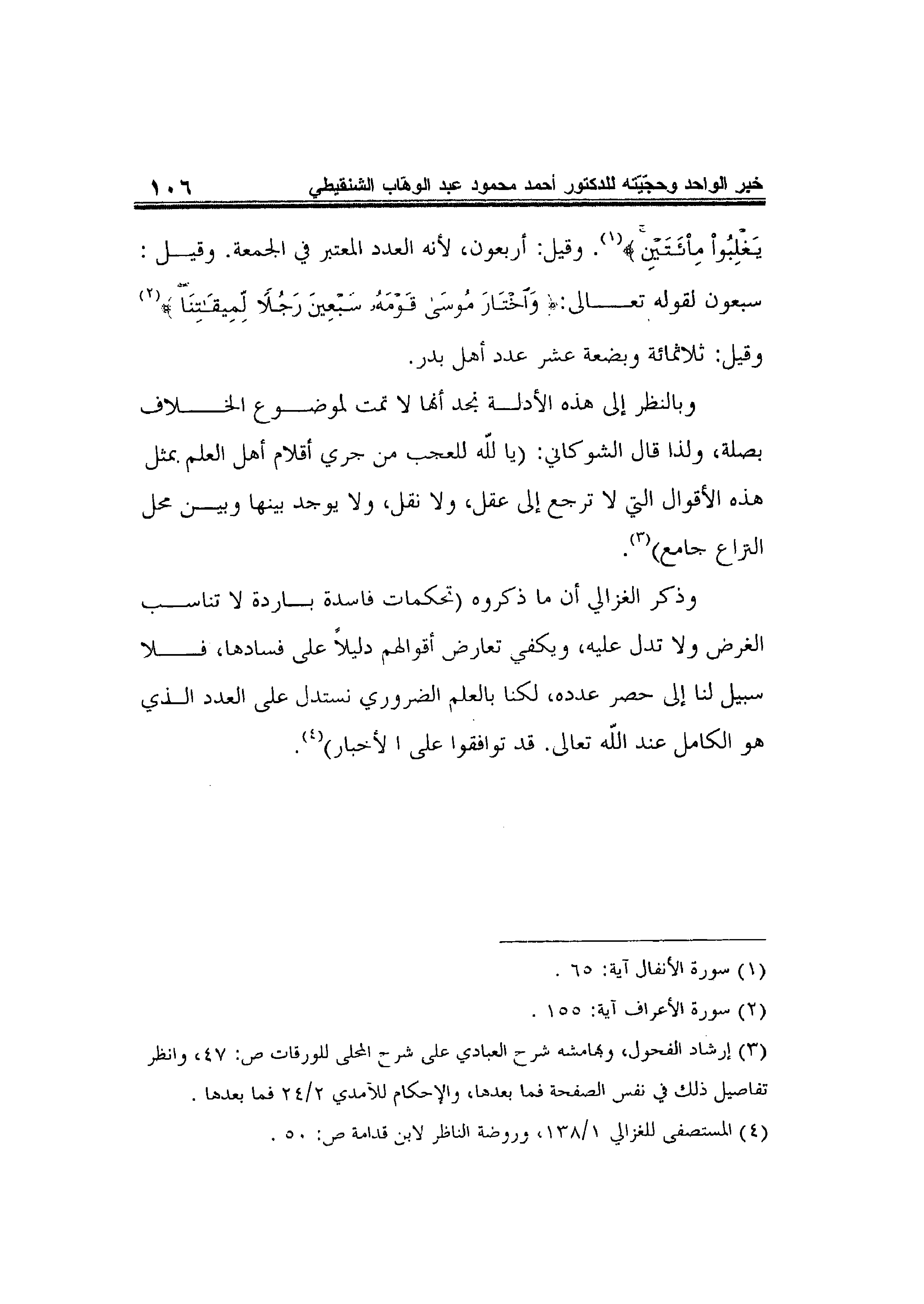 يَغْلِبُوا مِائَتَيْنِ} 1. وقيل: أربعون، لأنه العدد المعتبر في الجمعة. وقيل: سبعون لقوله تعالى: {وَاخْتَارَ مُوسَى قَوْمَهُ سَبْعِينَ رَجُلاً لِمِيقَاتِنَا} 2 وقيل: ثلاثمائة وبضعة عشر عدد أهل بدر.