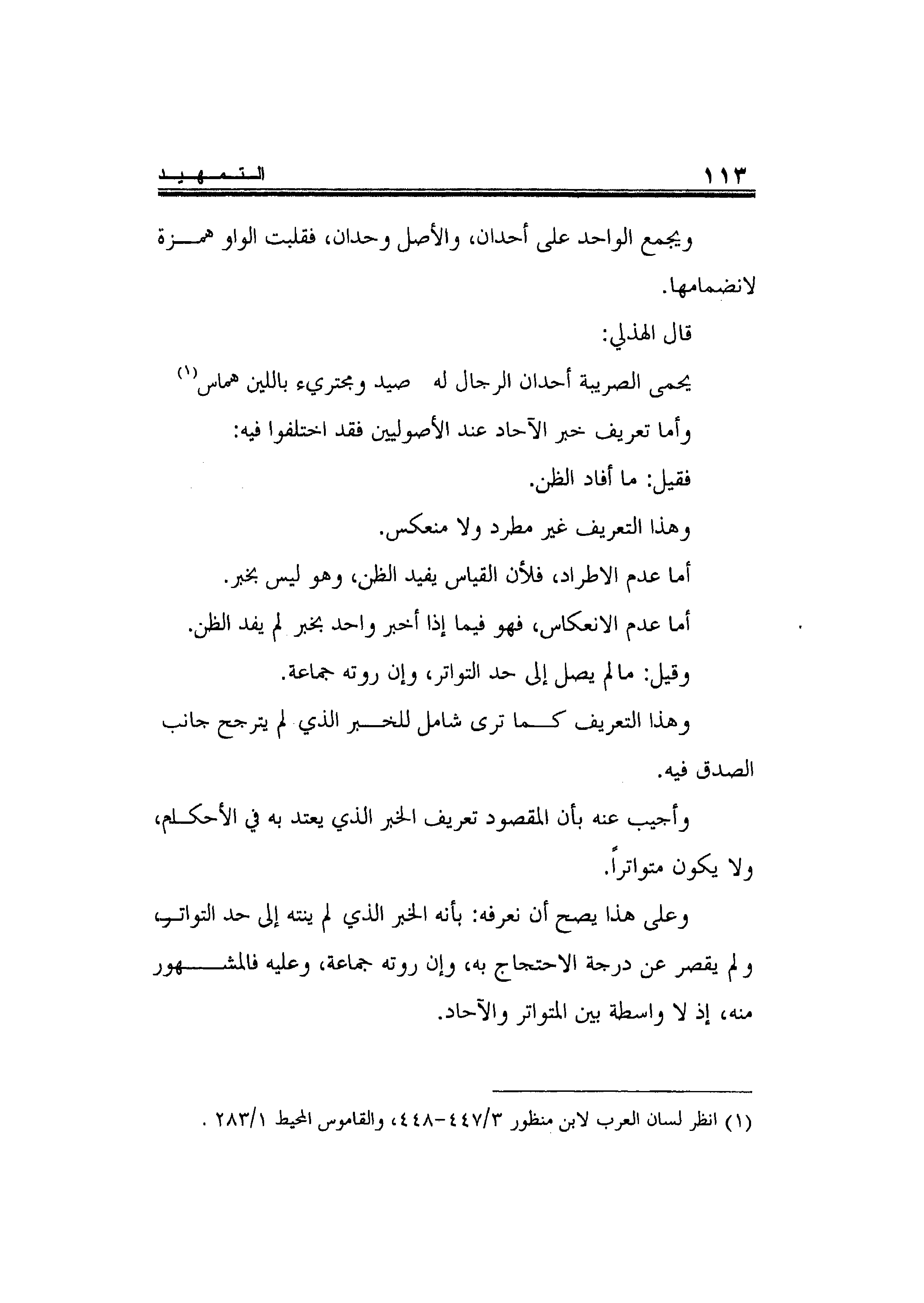 وعلى هذا يصح أن نعرفه: بأنه الخبر الذي لم ينته إلى حد التواتر، ولم يقصر عن درجة الاحتجاج به، وإن روته جماعة، وعليه فالمشهور منه، إذ لا واسطة بين المتواتر والآحاد.