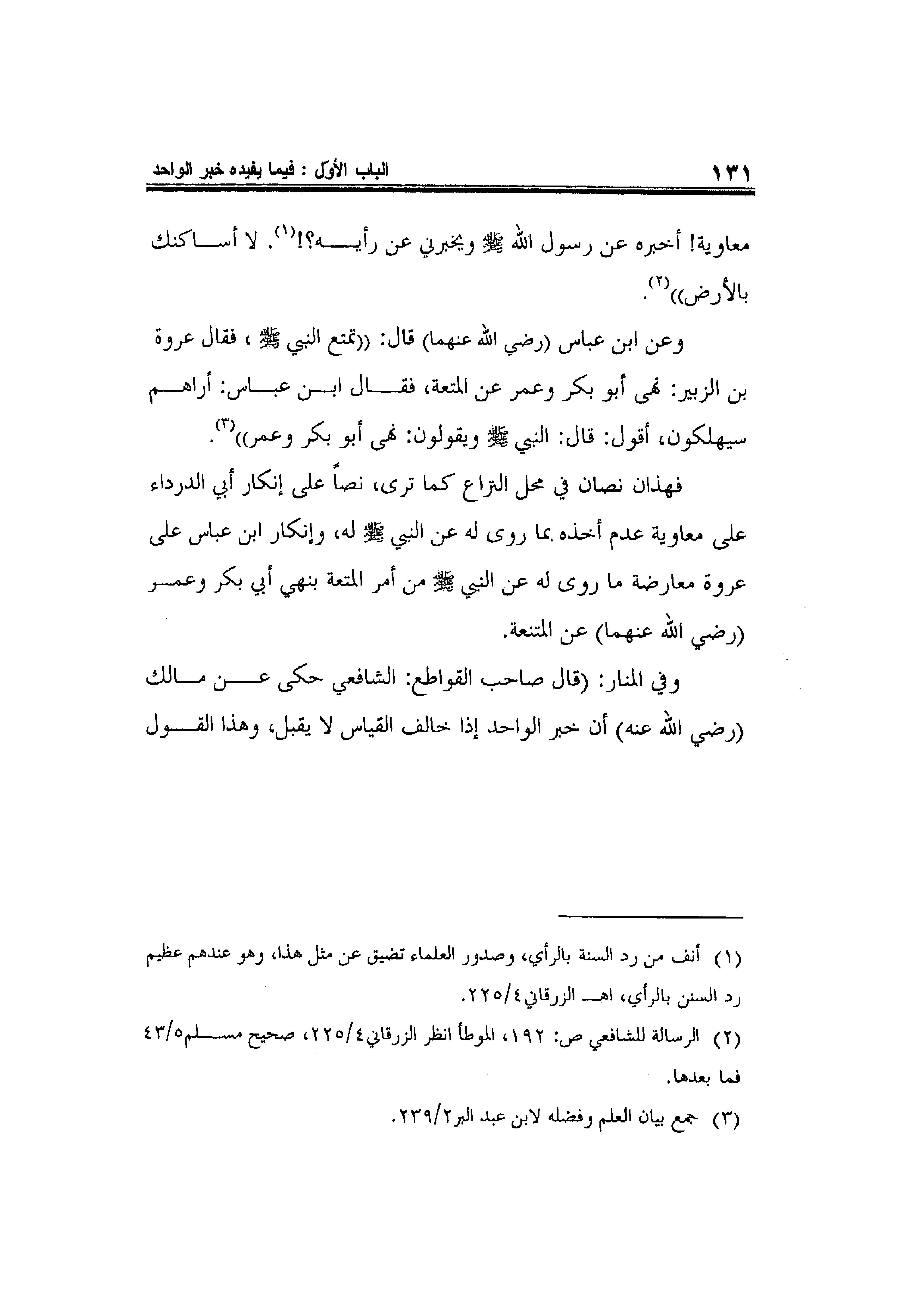 فهذان نصان في محل النزاع كما ترى، نصاً على إنكار أبي الدرداء على معاوية عدم أخذه بما روى له عن النبي صلى الله عليه وسلم له، وإنكار ابن عباس على عروة معارضة ما روى له عن النبي صلى الله عليه وسلم من أمر المتعة بنهي أبي بكر وعمر -رضي الله عنهما-عن المتنعة.