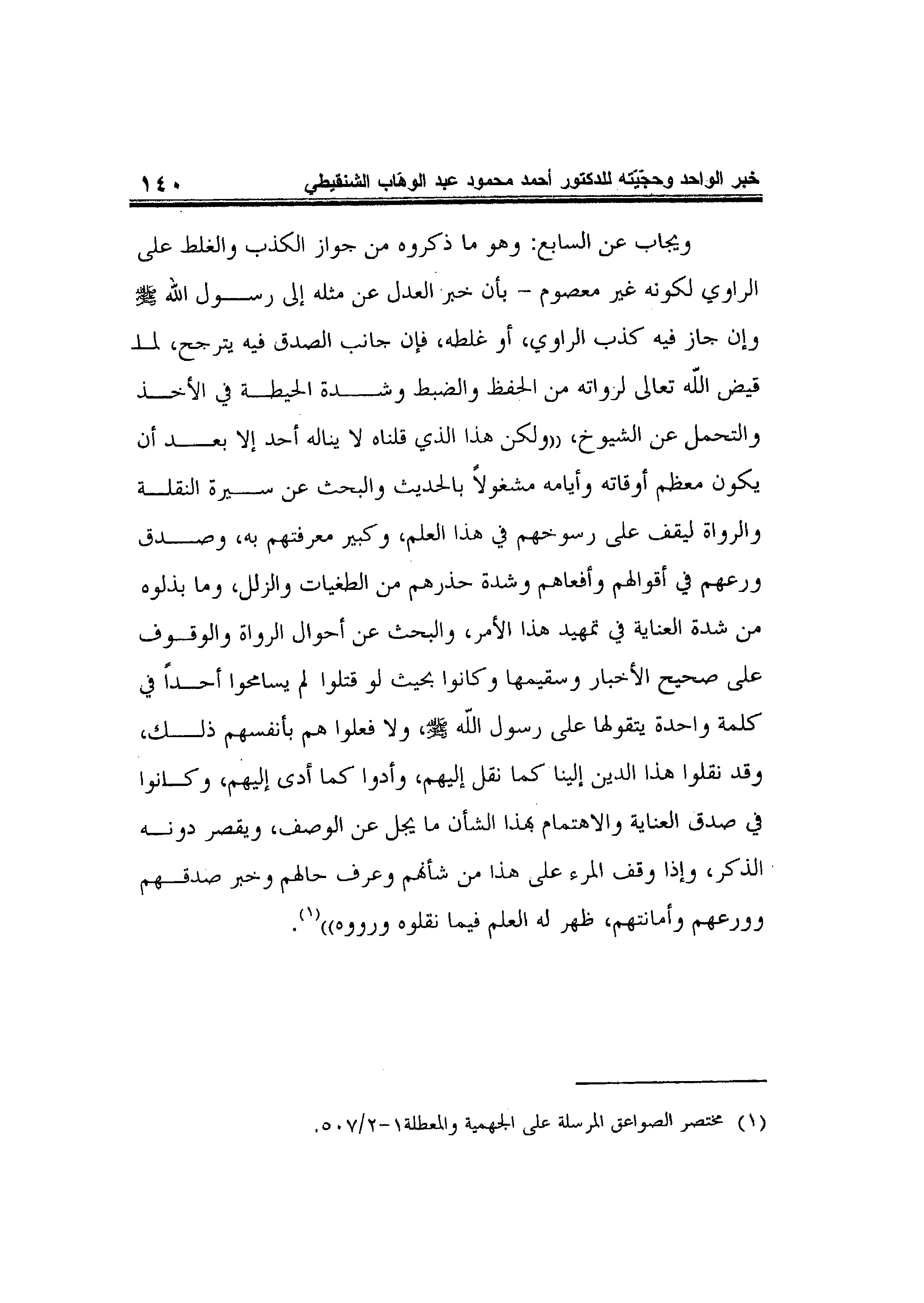 ويجاب عن السابع: وهو ما ذكروه من جواز الكذب والغلط على الراوي لكونه غير معصوم - بأن خبر العدل عن مثله إلى رسول الله صلى الله عليه وسلم وإن جاز فيه كذب الراوي، أو غلطه، فإن جانب الصدق فيه يترجح، لما قيض الله تعالى لرواته من الحفظ والضبط وشدة الحيطة في الأخذ والتحمل عن الشيوخ،"ولكن هذا الذي قلناه لا يناله أحد إلا بعد أن يكون معظم أوقاته وأيامه مشغولاً بالحديث والبحث عن سيرة النقلة والرواة ليقف على رسوخهم في هذا العلم، وكبير معرفتهم به، وصدق ورعهم في أقوالهم وأفعاهم وشدة حذرهم من الطغيات والزلل، وما بذلوه من شدة العناية في تمهيد هذا الأمر، والبحث عن أحوال الرواة والوقوف على صحيح الأخبار وسقيمها وكانوا بحيث لو قتلوا لم يسامحوا أحداً في كلمة واحدة يتقولها على رسول الله صلى الله عليه وسلم، ولا فعلوا هم بأنفسهم ذلك، وقد نقلوا هذا الدين إلينا كما نقل إليهم، وأدوا كما أدى إليهم، وكانوا في صدق العناية والاهتمام بهذا الشأن ما يجل عن الوصف، ويقصر دونه الذكر، وإذا وقف المرء على هذا من شأنهم وعرف حالهم وخبر صدقهم وورعهم وأمانتهم، ظهر له العلم فيما نقلوه ورووه"1.