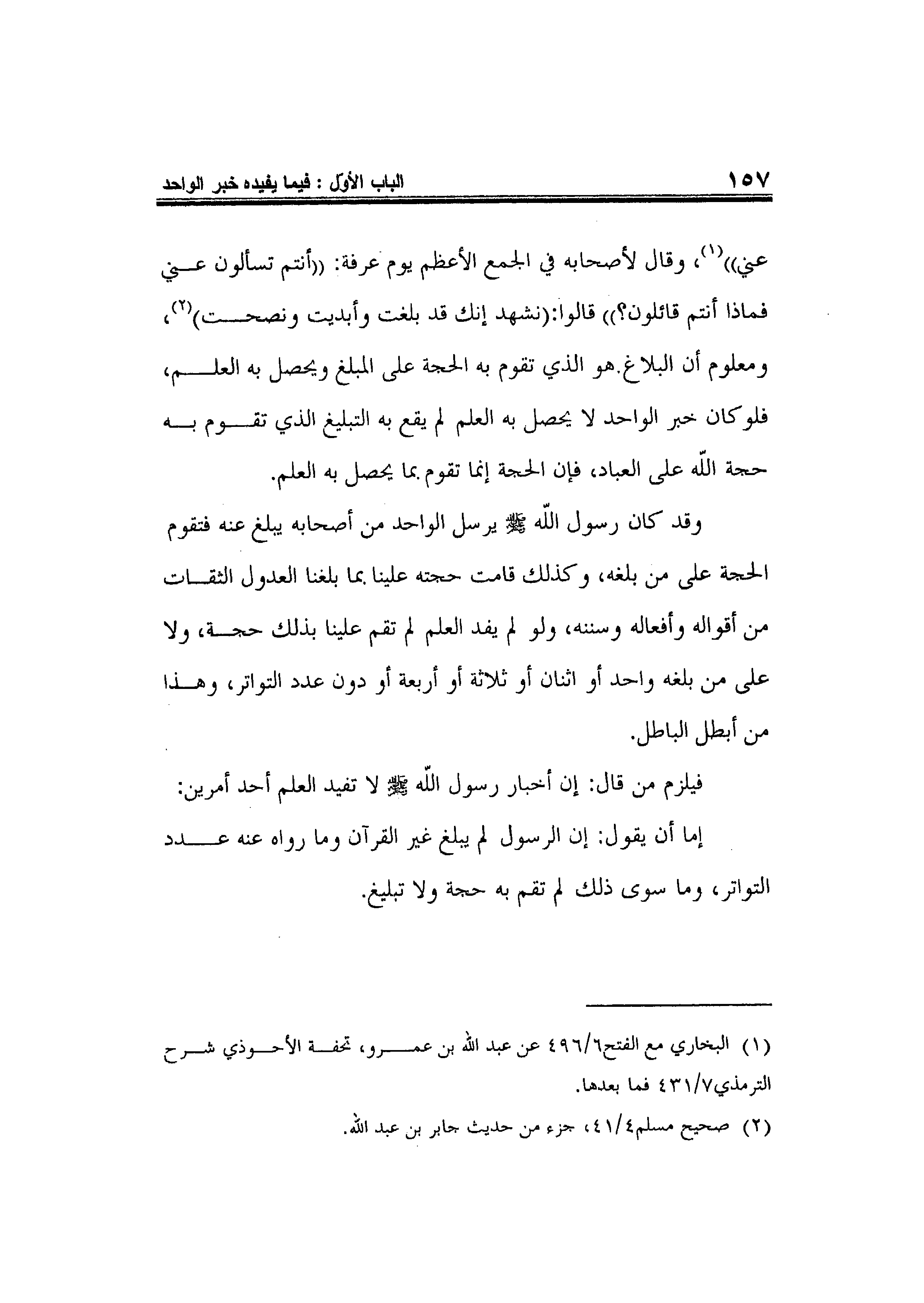 عني" 1، وقال لأصحابه في الجمع الأعظم يوم عرفة: " أنتم تسألون عني فماذا أنتم قائلون؟ " قالوا: "نشهد إنك قد بلغت وأبديت ونصحت" 2، ومعلوم أن البلاغ هو الذي تقوم به الحجة على المبلغ ويحصل به العلم، فلوكان خبر الواحد لا يحصل به العلم لم يقع به التبليغ الذي تقوم به حجة الله على العباد، فإن الحجة إنما تقوم بما يحصل به العلم. وقد كان رسول الله صلى الله عليه وسلم يرسل الواحد من أصحابه يبلغ عنه فتقوم الحجة على من بلغه، وكذلك قامت حجته علينا بما بلغنا العدول الثقات من أقواله وأفعاله وسننه، ولو لم يفد العلم لم تقم علينا بذلك حجة، ولا على من بلغه واحد أو اثنان أو ثلاثة أو أربعة أو دون عدد التواتر، وهذا من أبطل الباطل. فيلزم من قال: إن أخبار رسول الله صلى الله عليه وسلم لا تفيد العلم أحد أمرين: