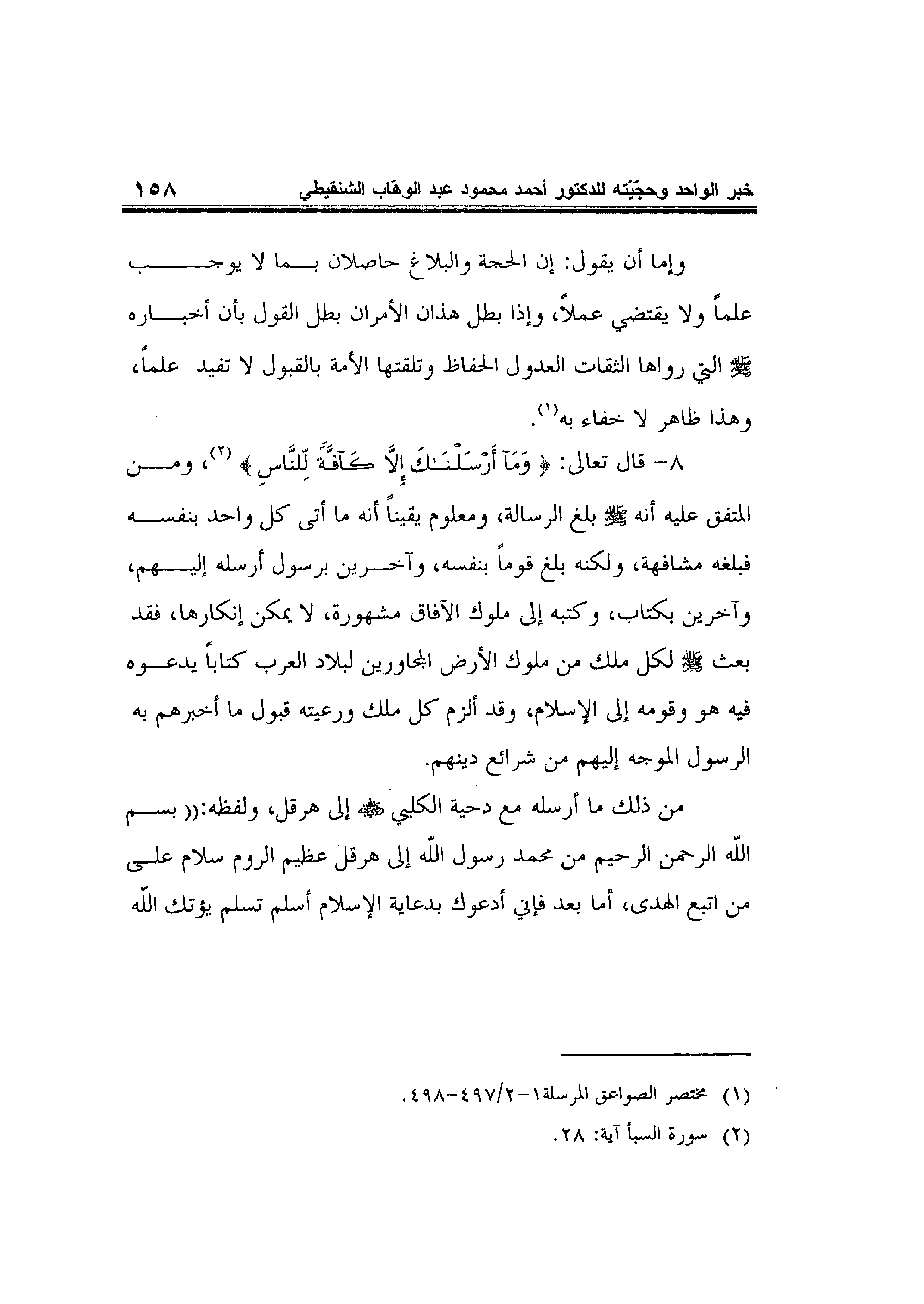 8- قال تعالى: {وَمَا أَرْسَلْنَاكَ إِلاَّ كَافَّةً لِلنَّاسِ} 2، ومن المتفق عليه أنه صلى الله عليه وسلم بلغ الرسالة، ومعلوم يقيناً أنه ما أتى كل واحد بنفسه فبلغه مشافهة، ولكنه بلغ قوماً بنفسه، وآخرين برسول أرسله إليهم، وآخرين بكتاب، وكتبه إلى ملوك الآفاق مشهورة، لا يمكن إنكارها، فقد بعث صلى الله عليه وسلم لكل ملك من ملوك الأرض المجاورين لبلاد العرب كتاباً يدعوه فيه هو وقومه إلى الإسلام، وقد ألزم كل ملك ورعيته قبول ما أخبرهم به الرسول الموجه إليهم من شرائع دينهم.