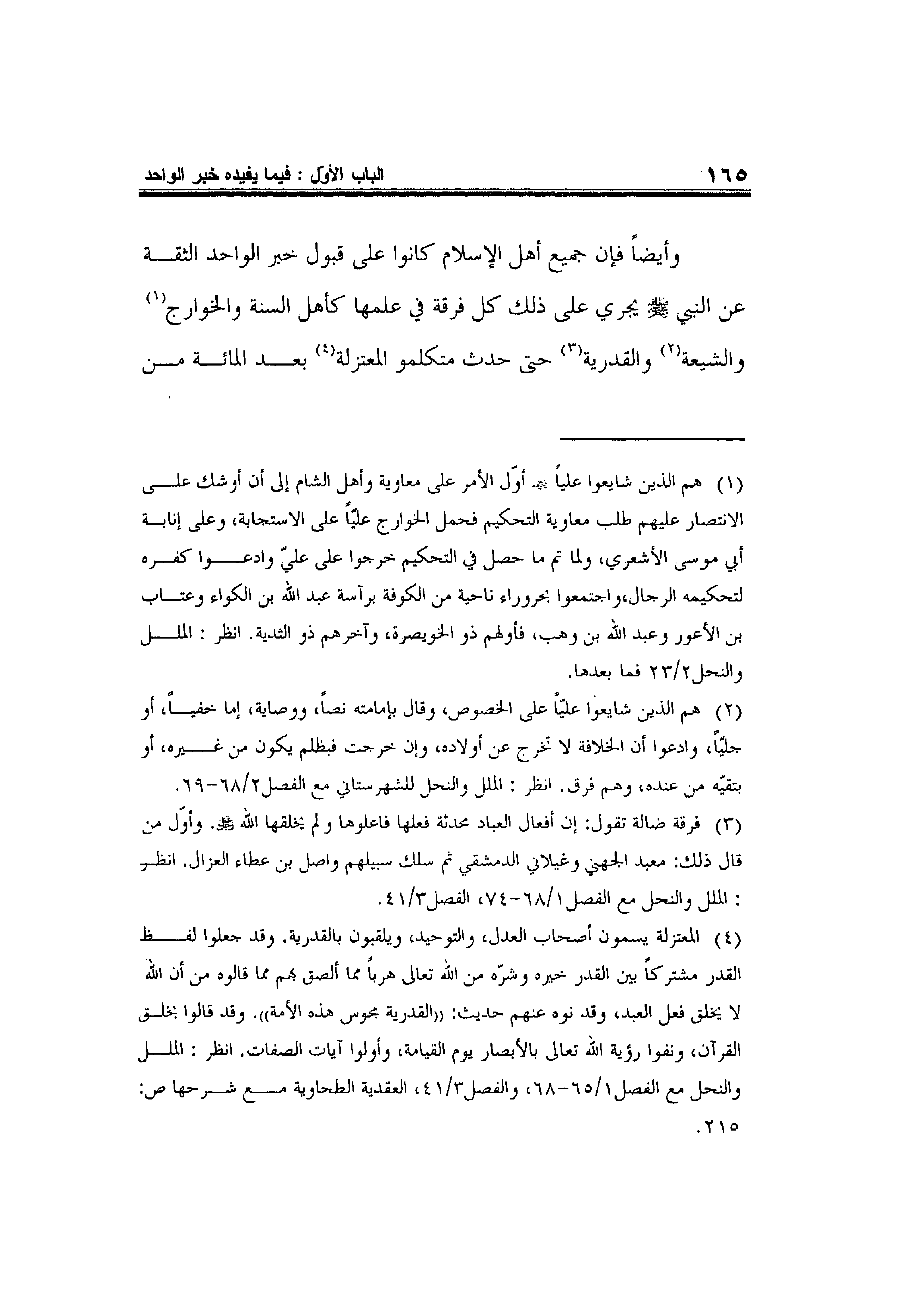 وأيضاً فإن جميع أهل الإسلام كانوا على قبول خبر الواحد الثقة عن النبي صلى الله عليه وسلم يجري على ذلك كل فرقة في علمها كأهل السنة والخوارج1 والشيعة2 والقدرية3 حتى حدث متكلمو المعتزلة4 بعد المائة من