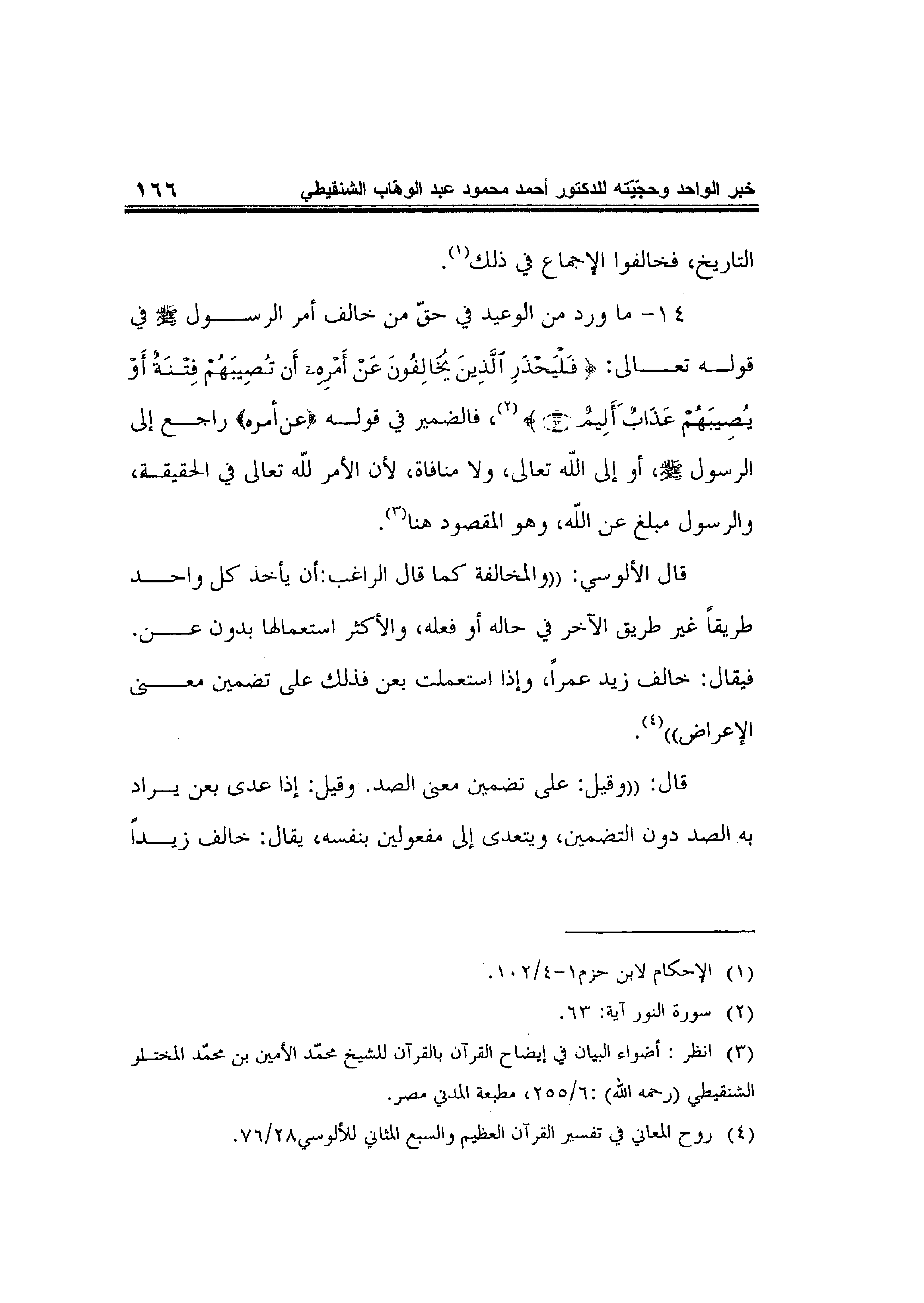 14- ما ورد من الوعيد في حقّ من خالف أمر الرسول صلى الله عليه وسلم في قوله تعالى: {فَلْيَحْذَرِ الَّذِينَ يُخَالِفُونَ عَنْ أَمْرِهِ أَنْ تُصِيبَهُمْ فِتْنَةٌ أَوْ يُصِيبَهُمْ عَذَابٌ أَلِيمٌ} 2، فالضمير في قوله {عَنْ أَمْرِهِ} راجع إلى الرسول صلى الله عليه وسلم، أو إلى الله تعالى، ولا منافاة، لأن الأمر لله تعالى في الحقيقة، والرسول مبلغ عن الله، وهو المقصود هنا3.