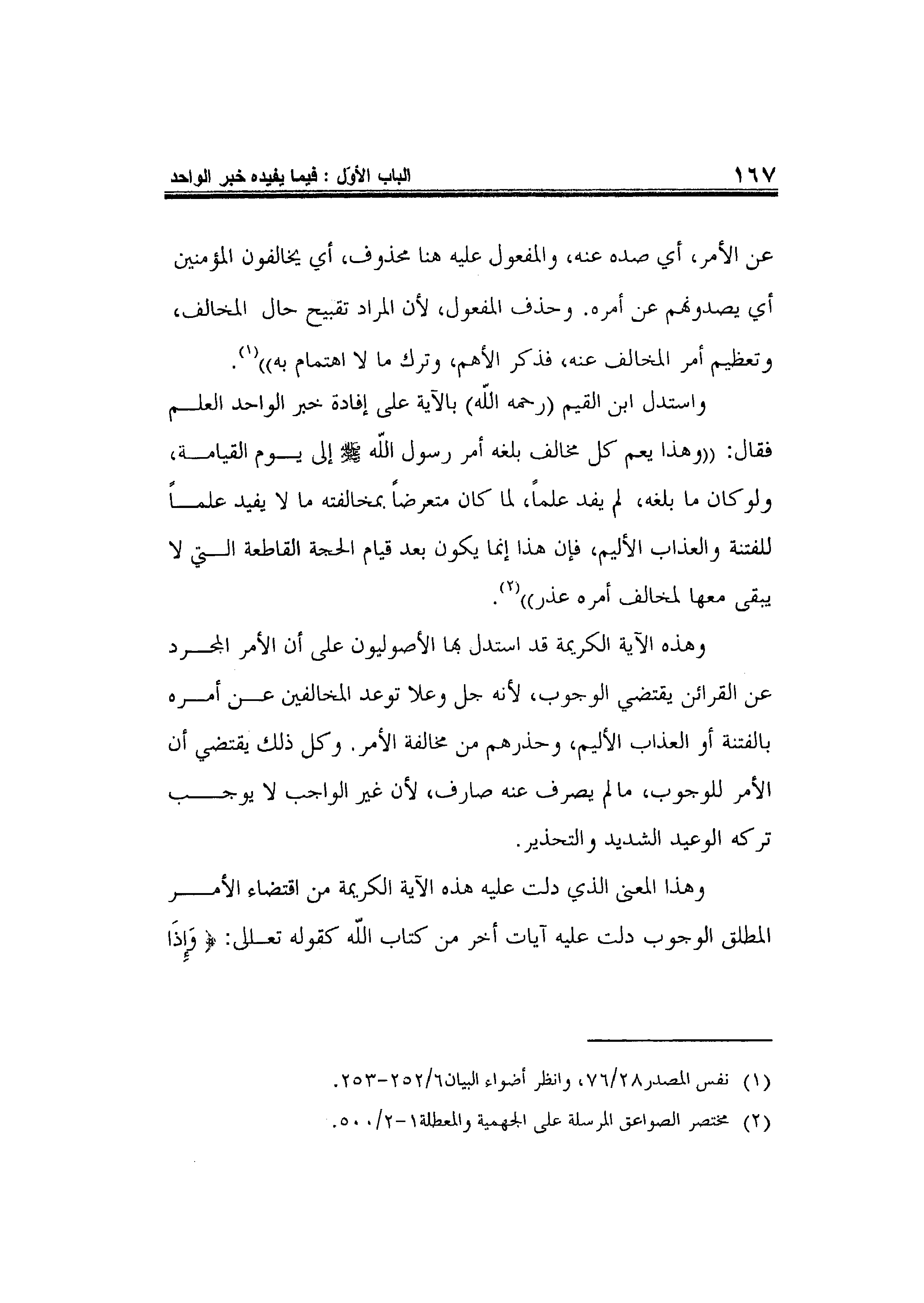 واستدل ابن القيم -رحمه الله- بالآية على إفادة خبر الواحد العلم فقال:"وهذا يعم كل مخالف بلغه أمر رسول الله صلى الله عليه وسلم إلى يوم القيامة، ولوكان ما بلغه، لم يفد علماً، لما كان متعرضاً بمخالفته ما لا يفيد علماً للفتنة والعذاب الأليم، فإن هذا إنما يكون بعد قيام الحجة القاطعة التي لا يبقى معها لمخالف أمره عذر"2. وهذه الآية الكريمة قد استدل بها الأصوليون على أن الأمر المجرد عن القرائن يقتضي الوجوب، لأنه جل وعلا توعد المخالفين عن أمره بالفتنة أو العذاب الأليم، وحذرهم من مخالفة الأمر. وكل ذلك يقتضي أن الأمر للوجوب، مالم يصرف عنه صارف، لأن غير الواجب لا يوجب تركه الوعيد الشديد والتحذير.