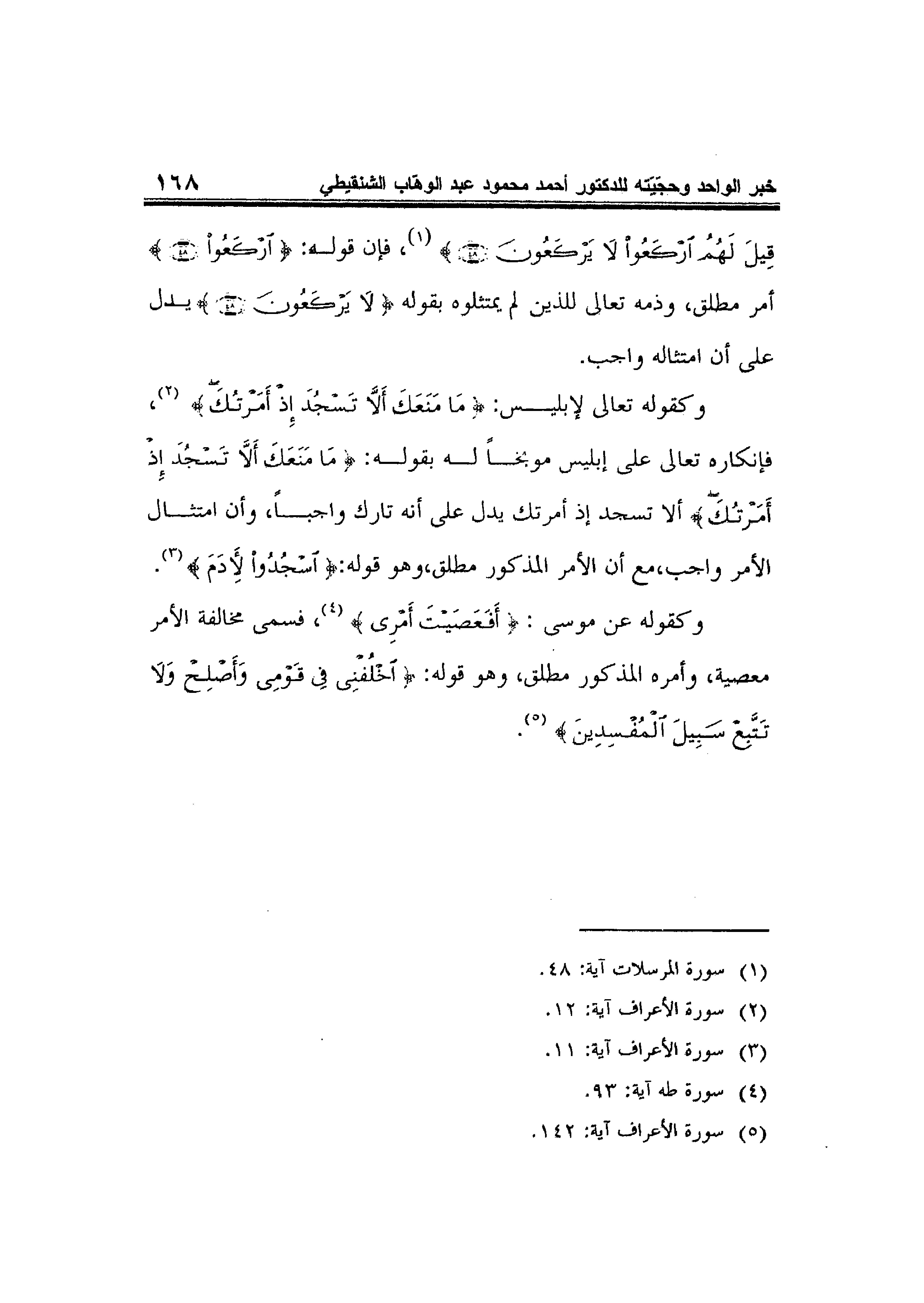 وكقوله تعالى لإبليس: {مَا مَنَعَكَ أَلاَّ تَسْجُدَ إِذْ أَمَرْتُكَ} 2، فإنكاره تعالى على إبليس موبخاً له بقوله: {مَا مَنَعَكَ أَلاَّ تَسْجُدَ إِذْ أَمَرْتُكَ} ألا تسجد إذ أمرتك يدل على أنه تارك واجباً، وأن امتثال الأمر واجب، مع أن الأمر المذكور مطلق، وهو قوله: {اسْجُدُوا لآدَمَ} 3.
