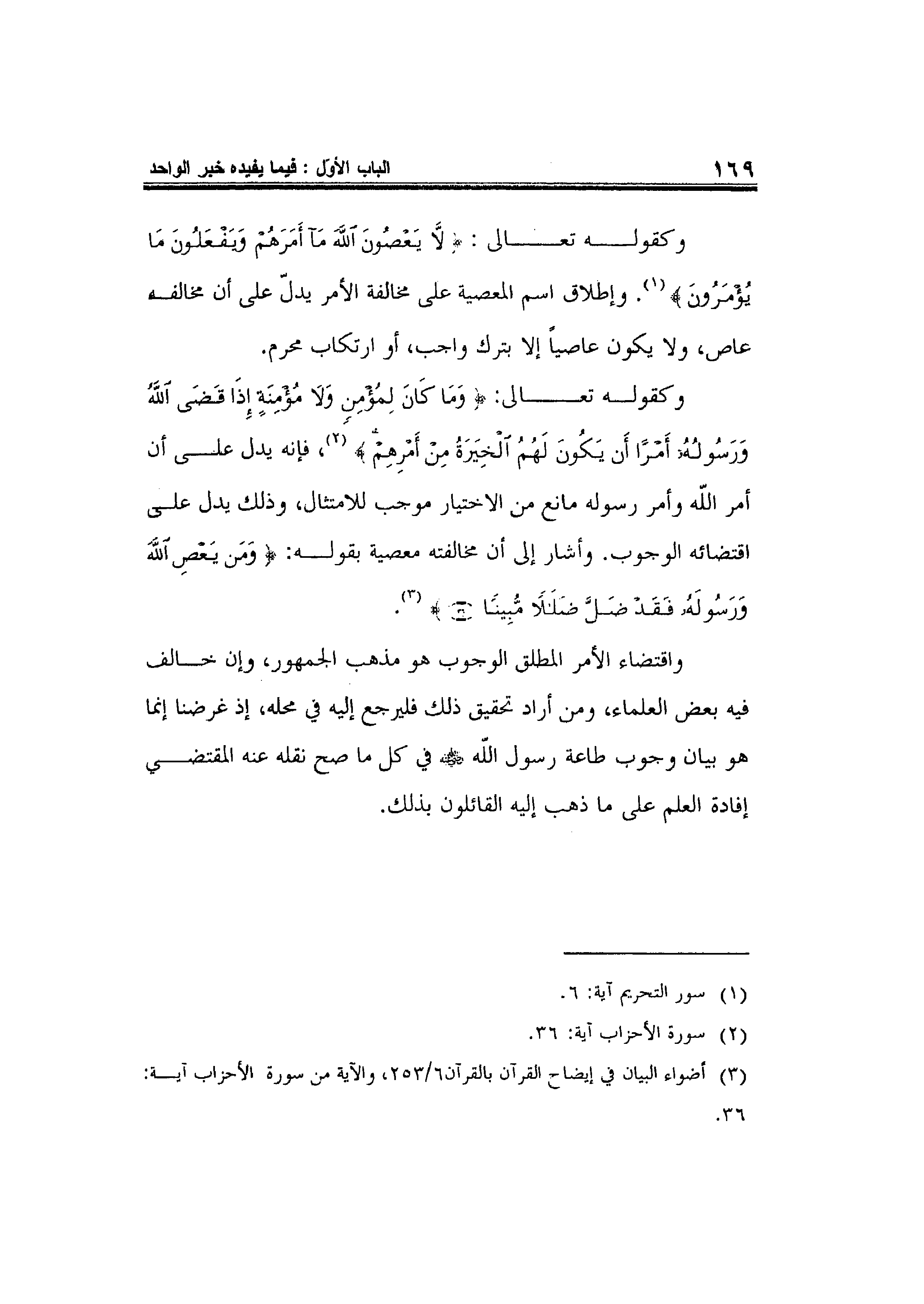 وكقوله تعالى: {وَمَا كَانَ لِمُؤْمِنٍ وَلا مُؤْمِنَةٍ إِذَا قَضَى اللَّهُ وَرَسُولُهُ أَمْراً أَنْ يَكُونَ لَهُمُ الْخِيَرَةُ مِنْ أَمْرِهِمْ} 2، فإنه يدل على أن أمر الله وأمر رسوله مانع من الاختيار موجب للامتثال، وذلك يدل على اقتضائه الوجوب. وأشار إلى أن مخالفته معصية بقوله: {وَمَنْ يَعْصِ اللَّهَ وَرَسُولَهُ فَقَدْ ضَلَّ ضَلالاً مُبِيناً} 3. واقتضاء الأمر المطلق الوجوب هو مذهب الجمهور، وإن خالف فيه بعض العلماء، ومن أراد تحقيق ذلك فليرجع إليه في محله، إذ غرضنا إنما هو بيان وجوب طاعة رسول الله رضي الله عنه في كل ما صح نقله عنه المقتضي إفادة العلم على ما ذهب إليه القائلون بذلك.