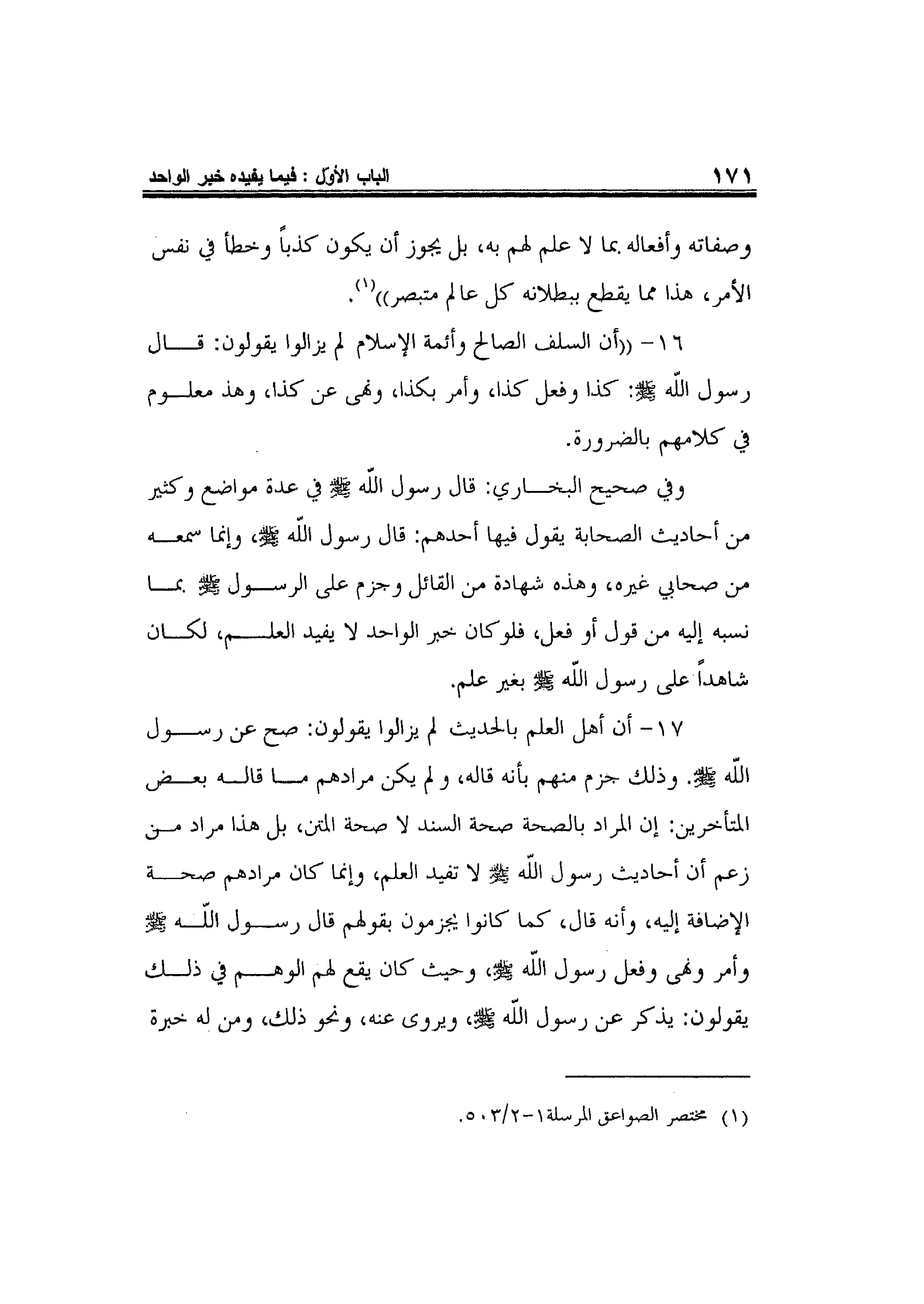 16-"أن السلف الصالح وأئمة الإسلام لم يزالوا يقولون: قال رسول الله صلى الله عليه وسلم: كذا وفعل كذا، وأمر بكذا، ونهى عن كذا، وهذ معلوم في كلامهم بالضرورة.