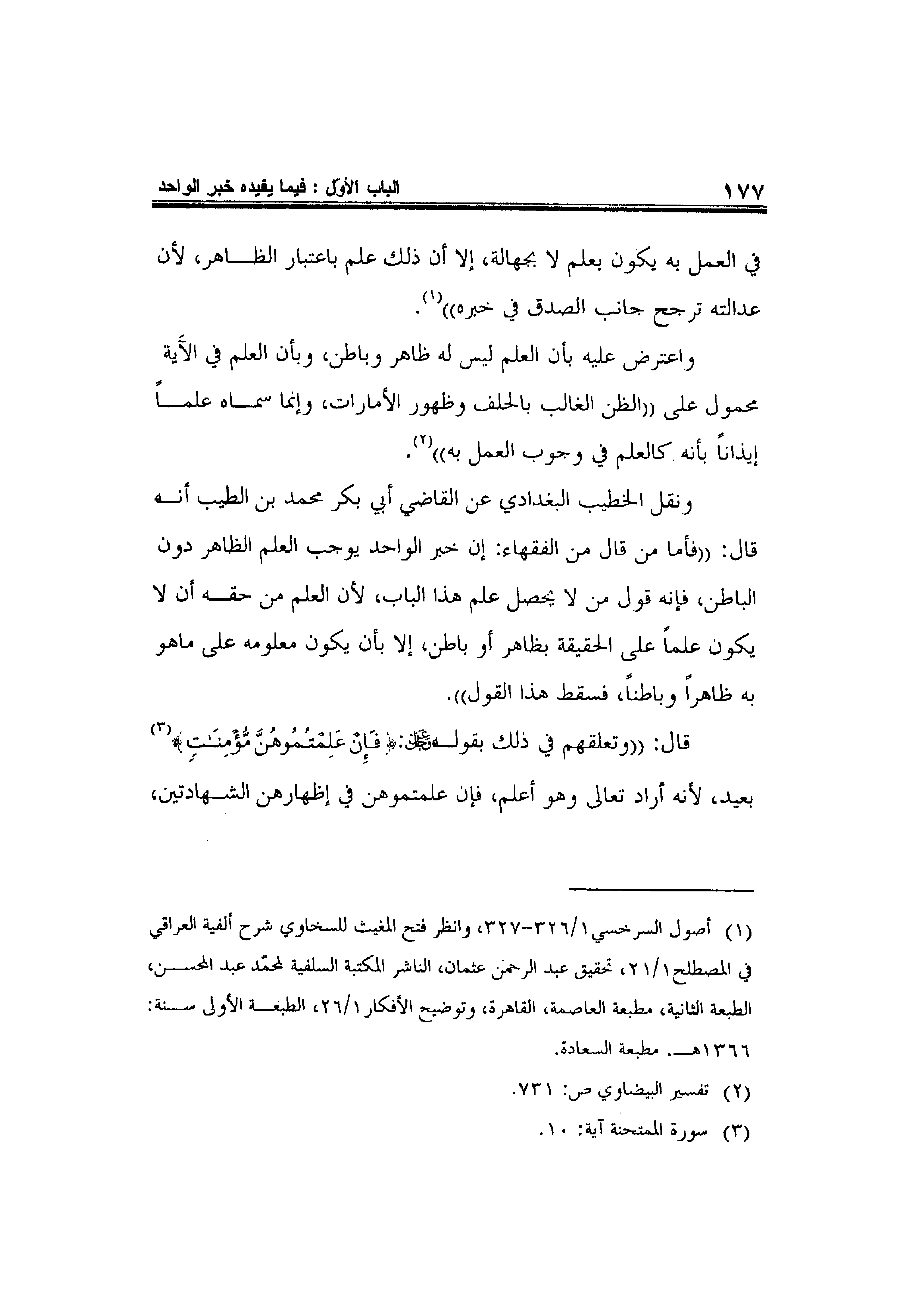 1 أصول السرخسي1/326-327، وانظر فتح المغيث للسخاوي شرح ألفية العراقي في المصطلح1/21، تحقيق عبد الرحمن عثمان، الناشر المكتبة السلفية لمحمّد عبد المحسن، الطبعة الثانية، مطبعة العاصمة، القاهرة، وتوضيح الأفكار1/26، الطبعة الأولى سنة: 1366هـ. مطبعة السعادة.