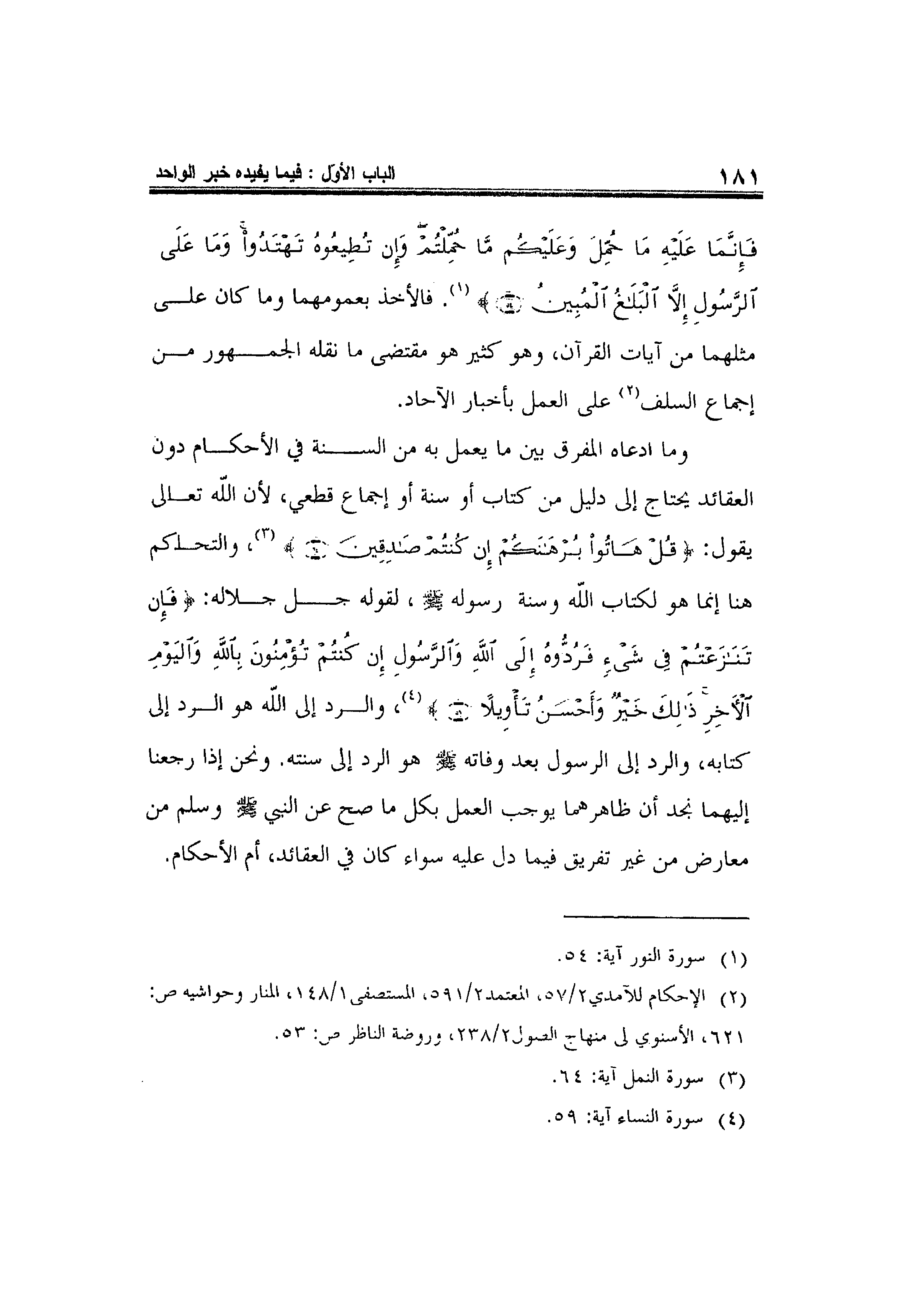 فَإِنَّمَا عَلَيْهِ مَا حُمِّلَ وَعَلَيْكُمْ مَا حُمِّلْتُمْ وَإِنْ تُطِيعُوهُ تَهْتَدُوا وَمَا عَلَى الرَّسُولِ إلاَّ الْبَلاغُ الْمُبِينُ} 1. فالأخذ بعمومهما وما كان على مثلهما من آيات القرآن، وهو كثير هو مقتضى ما نقله الجمهور من إجماع السلف2 على العمل بأخبار الآحاد. وما ادعاه المفرق بين ما يعمل به من السنة في الأحكام دون العقائد يحتاج إلى دليل من كتاب أو سنة أو إجماع قطعي، لأن الله تعالى يقول: {قُلْ هَاتُوا بُرْهَانَكُمْ إِنْ كُنْتُمْ صَادِقِينَ} 3، والتحاكم هنا إنما هو لكتاب الله وسنة رسوله صلى الله عليه وسلم، لقوله جل جلاله: {فَإِنْ تَنَازَعْتُمْ فِي شَيْءٍ فَرُدُّوهُ إِلَى اللَّهِ وَالرَّسُولِ إِنْ كُنْتُمْ تُؤْمِنُونَ بِاللَّهِ وَالْيَوْمِ الآخِرِ ذَلِكَ خَيْرٌ وَأَحْسَنُ تَأْوِيلاً} 4، والرد إلى الله هو الرد إلى كتابه، والرد إلى الرسول بعد وفاته صلى الله عليه وسلم هو الرد إلى سنته. ونحن إذا رجعنا إليهما نجد أن ظاهرهما يوجب العمل بكل ما صح عن النبي صلى الله عليه وسلم وسلم من معارض من غير تفريق فيما دل عليه سواء كان في العقائد، أم الأحكام.
