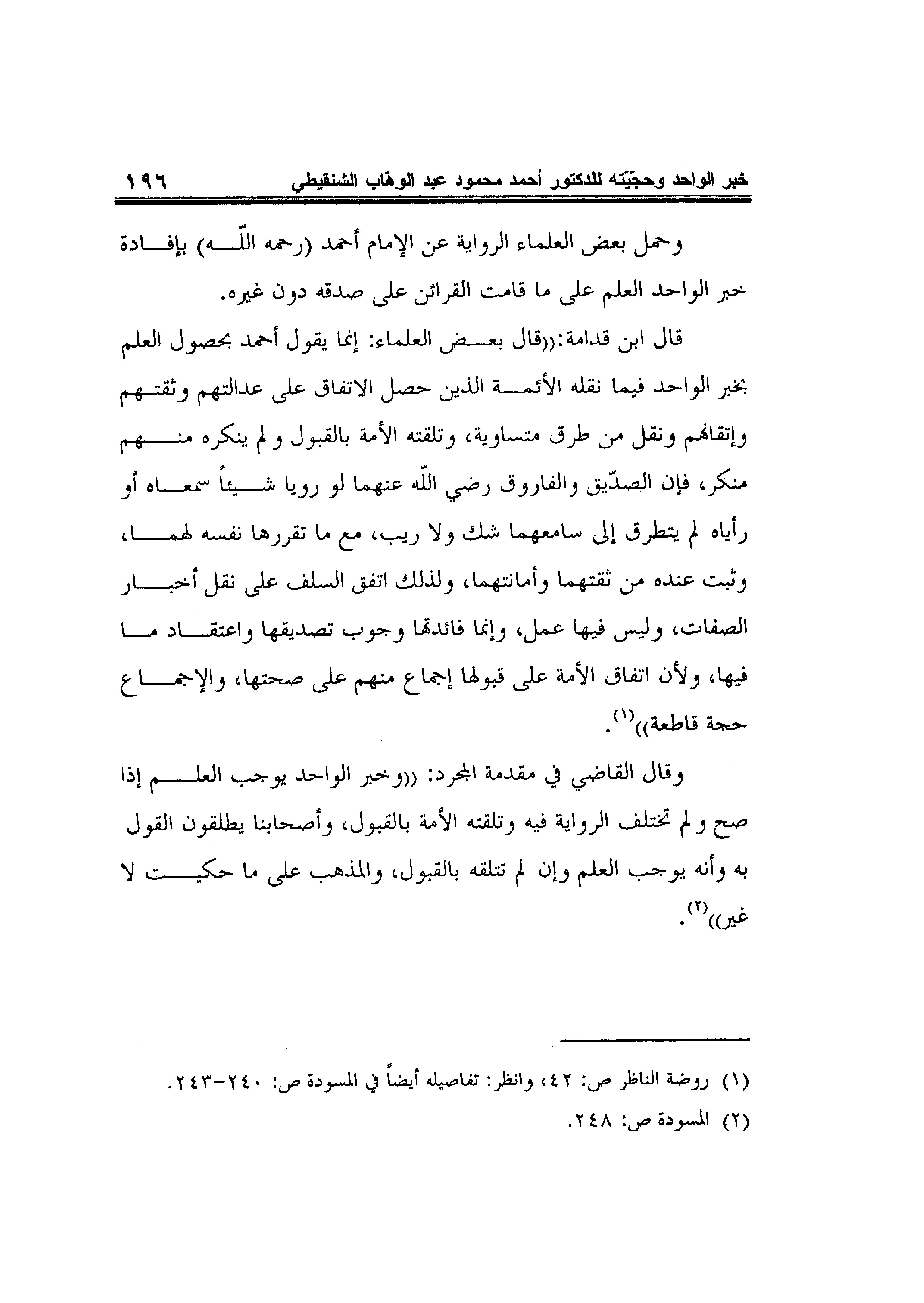 قال ابن قدامة: "قال بعض العلماء: إنما يقول أحمد بحصول العلم بخبر الواحد فيما نقله الأئمة الذين حصل الاتفاق على عدالتهم وثقتهم وإتقانهم ونقل من طرق متساوية، وتلقته الأمة بالقبول ولم ينكره منهم منكر، فإن الصدّيق والفاروق رضي الله عنهما لو رويا شيئاً سمعاه أو رأياه لم يتطرق إلى سامعهما شك ولا ريب، مع ما تقررها نفسه لهما، وثبت عنده من ثقتهما وأمانتهما، ولذلك اتفق السلف على نقل أخبار الصفات، وليس فيها عمل، وإنما فائدتها وجوب تصديقها واعتقاد ما فيها، ولأن اتفاق الأمة على قبولها إجماع منهم على صحتها، والإجماع حجة قاطعة"1.