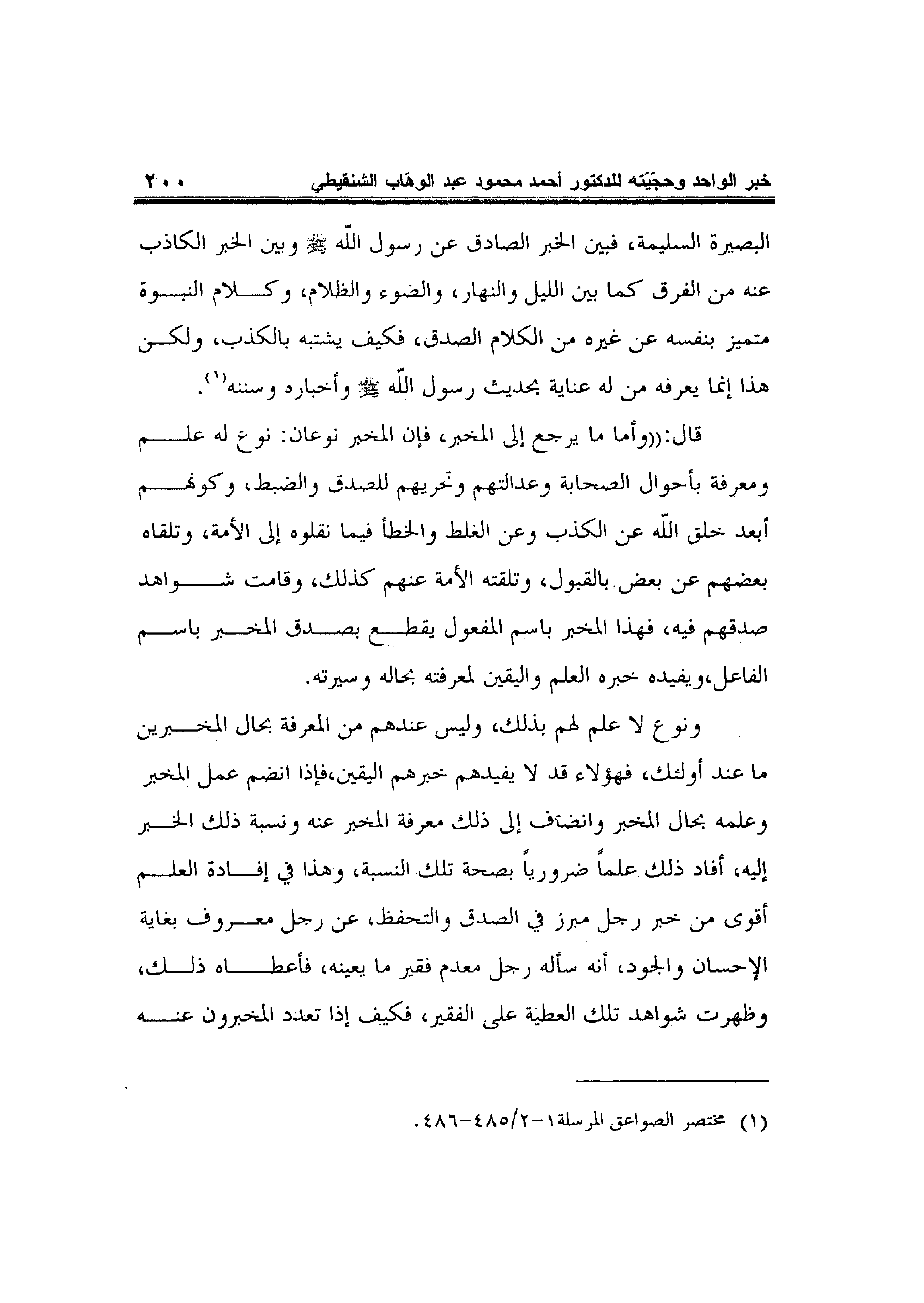 قال: "وأما ما يرجع إلى المخبر، فإن المخبر نوعان: نوع له علم ومعرفة بأحوال الصحابة وعدالتهم وتحريهم للصدق والضبط، وكونهم أبعد خلق الله عن الكذب وعن الغلط والخطأ فيما نقلوه إلى الأمة، وتلقاه بعضهم عن بعض بالقبول، وتلقته الأمة عنهم كذلك، وقامت شواهد صدقهم فيه، فهذا المخبر باسم المفعول يقطع بصدق المخبر باسم الفاعل، ويفيده خبره العلم واليقين لمعرفته بحاله وسيرته. ونوع لا علم لهم بذلك، وليس عندهم من المعرفة بحال المخبرين ما عند أولئك، فهؤلاء قد لا يفيدهم خبرهم اليقين، فإذا انضم عمل المخبر وعلمه بحال المخبر وانضاف إلى ذلك معرفة المخبر عنه ونسبة ذلك الخبر إليه، أفاد ذلك علماً ضرورياً بصحة تلك النسبة، وهذا في إفادة العلم أقوى من خبر رجل مبرز في الصدق والتحفظ، عن رجل معروف بغاية الإحسان والجود، أنه سأله رجل معدم فقير ما يعينه، فأعطاه ذلك، وظهرت شواهد تلك العطية على الفقير، فكيف إذا تعدد المخبرون عنه
