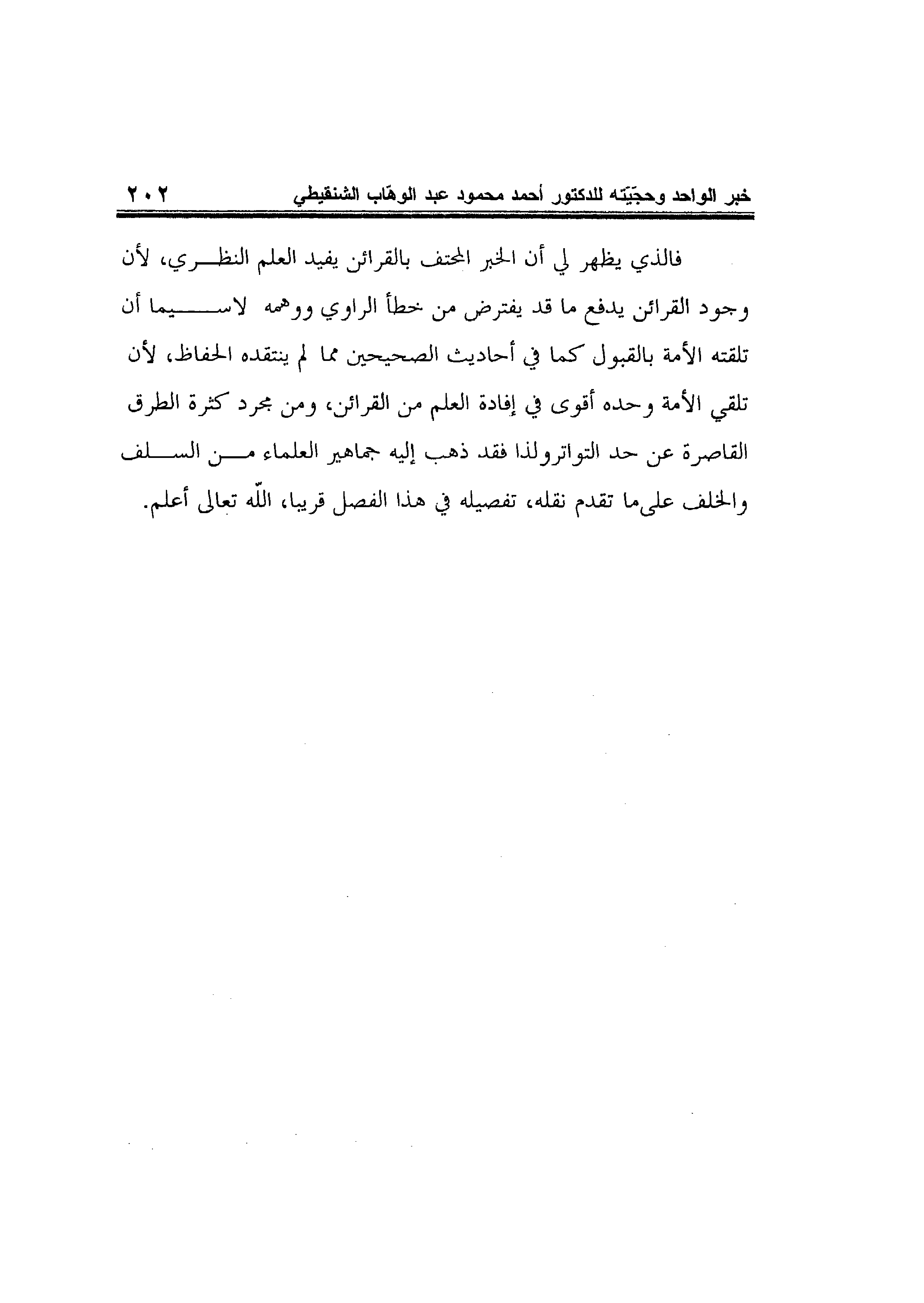 فالذي يظهر لي أن الخبر المحتف بالقرائن يفيد العلم النظري، لأن وجود القرائن يدفع ما قد يفترض من خطأ الراوي ووهمه لاسيما أن تلقته الأمة بالقبول كما في أحاديث الصحيحين مما لم ينتقده الحفاظ، لأن تلقي الأمة وحده أقوى في إفادة العلم من القرائن، ومن مجرد كثرة الطرق القاصرة عن حد التواترولذا فقد ذهب إليه جماهير العلماء من السلف والخلف علىما تقدم نقله، تفصيله في هذا الفصل قريبا، الله تعالى أعلم.