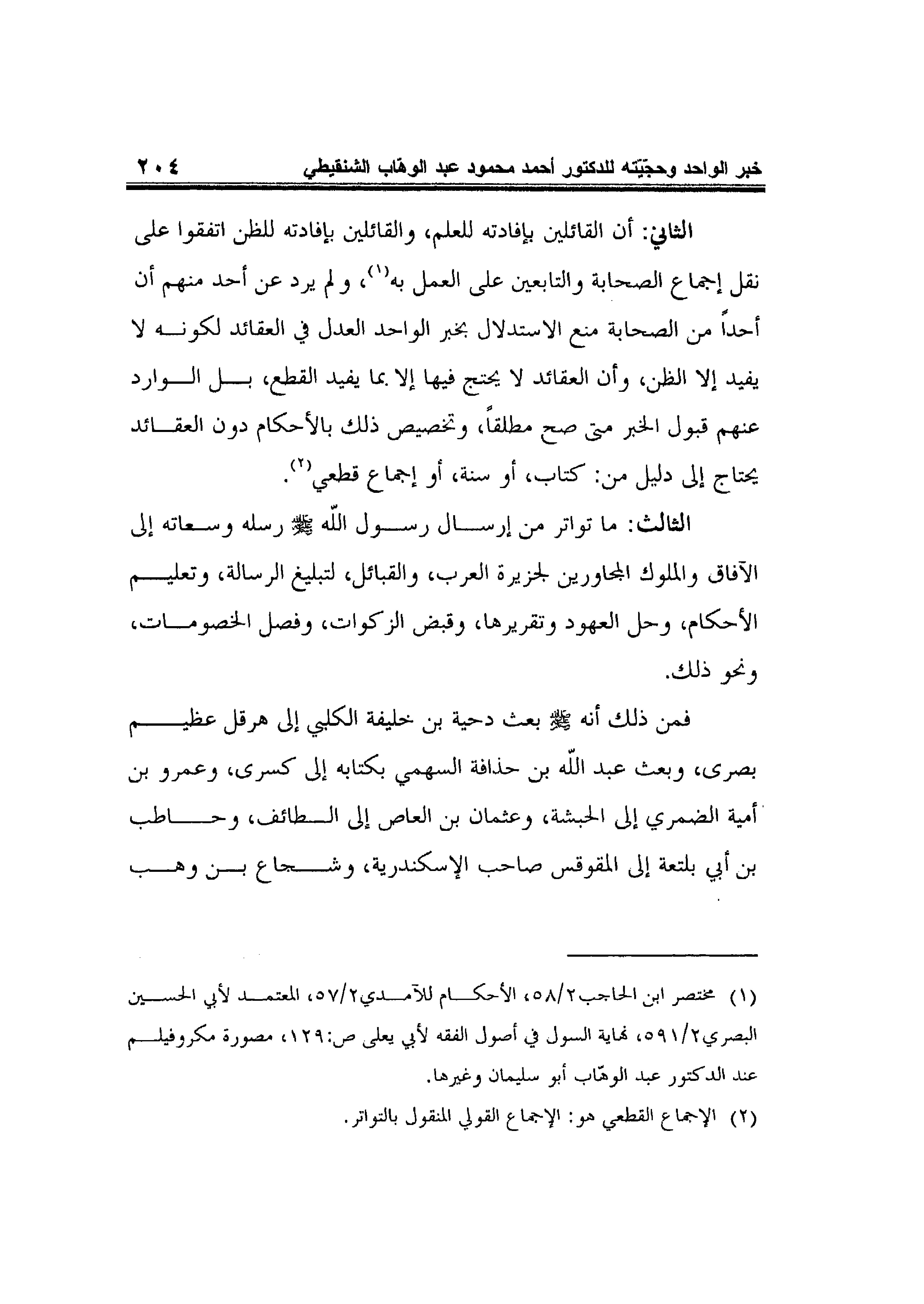 الثاني: أن القائلين بإفادته للعلم، والقائلين بإفادته للظن اتفقوا على نقل إجماع الصحابة والتابعين على العمل به1، ولم يرد عن أحد منهم أن أحداً من الصحابة منع الاستدلال بخبر الواحد العدل في العقائد لكونه لا يفيد إلا الظن، وأن العقائد لا يحتج فيها إلا بما يفيد القطع، بل الوارد عنهم قبول الخبر متى صح مطلقاً، وتخصيص ذلك بالأحكام دون العقائد يحتاج إلى دليل من: كتاب، أو سنة، أو إجماع قطعي2.