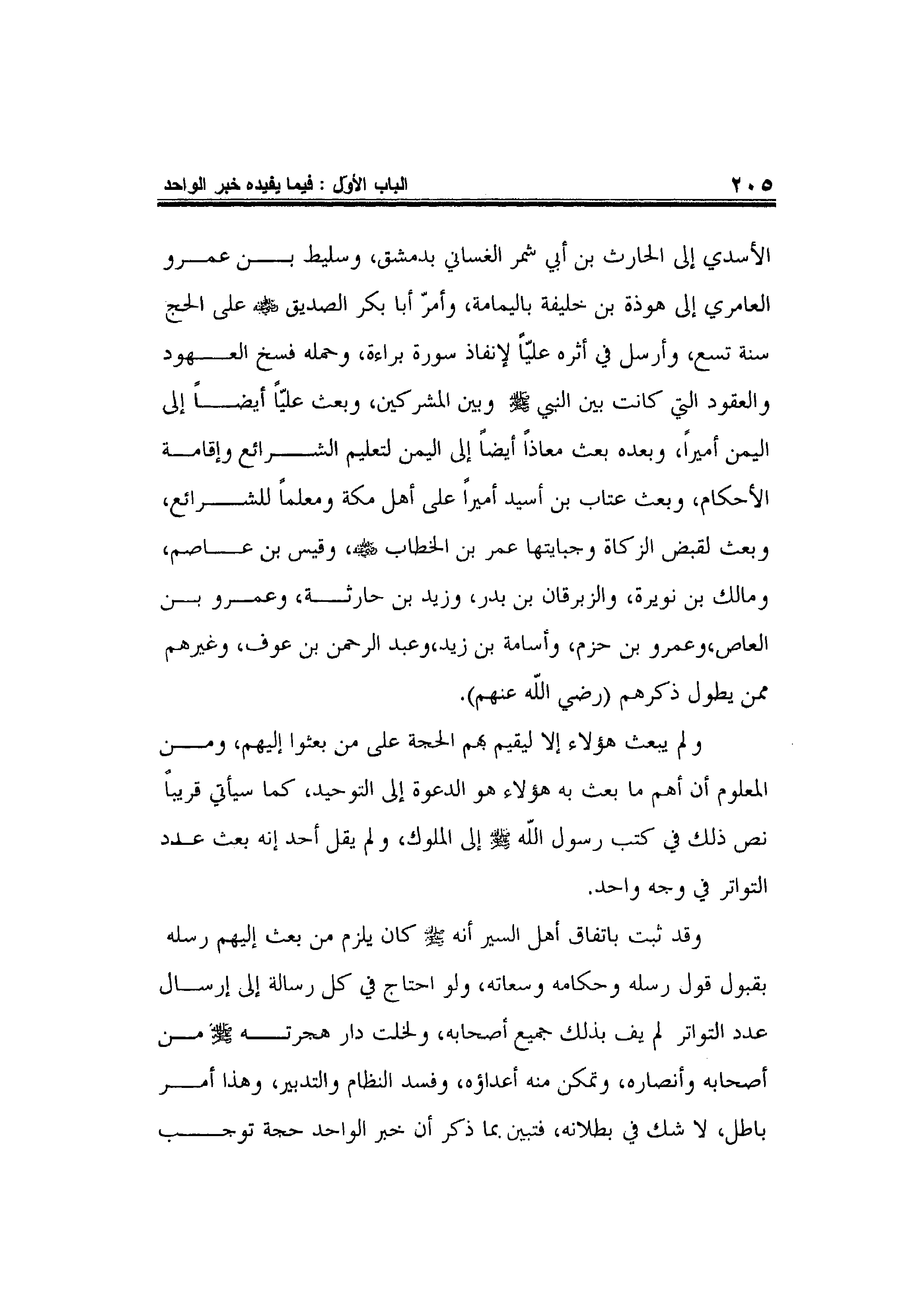 ولم يبعث هؤلاء إلا ليقيم بهم الحجة على من بعثوا إليهم، ومن المعلوم أن أهم ما بعث به هؤلاء هو الدعوة إلى التوحيد، كما سيأتي قريباً نص ذلك في كتب رسول الله صلى الله عليه وسلم إلى الملوك، ولم يقل أحد إنه بعث عدد التواتر في وجه واحد.