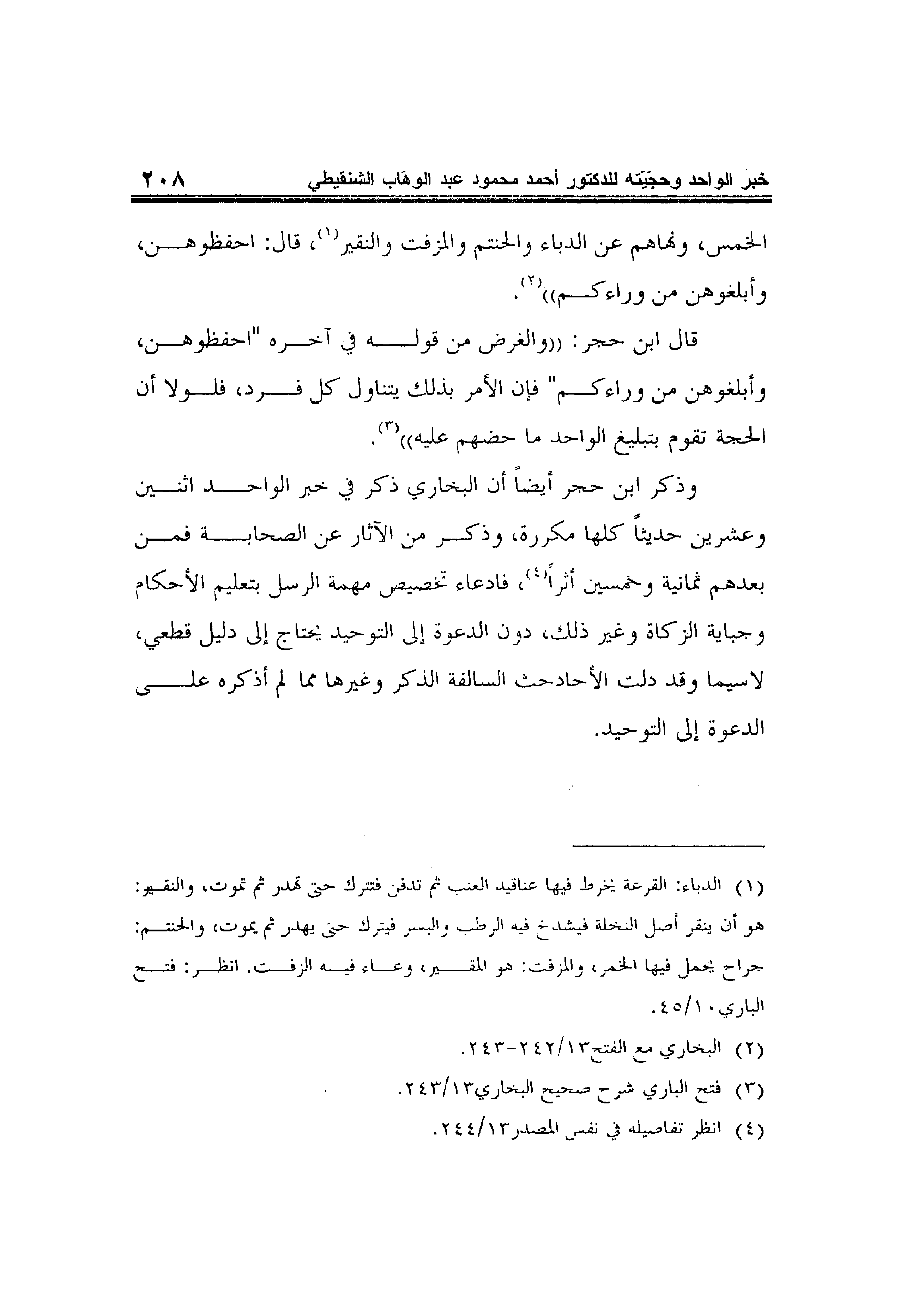وذكر ابن حجر أيضاً أن البخاري ذكر في خبر الواحد اثنين وعشرين حديثاً كلها مكررة، وذكر من الآثار عن الصحابة فمن بعدهم ثمانية وخمسين أثراً4، فادعاء تخصيص مهمة الرسل بتعليم الأحكام وجباية الزكاة وغير ذلك، دون الدعوة إلى التوحيد يحتاج إلى دليل قطعي، لاسيما وقد دلت الأحادحث السالفة الذكر وغيرها مما لم أذكره على الدعوة إلى التوحيد.