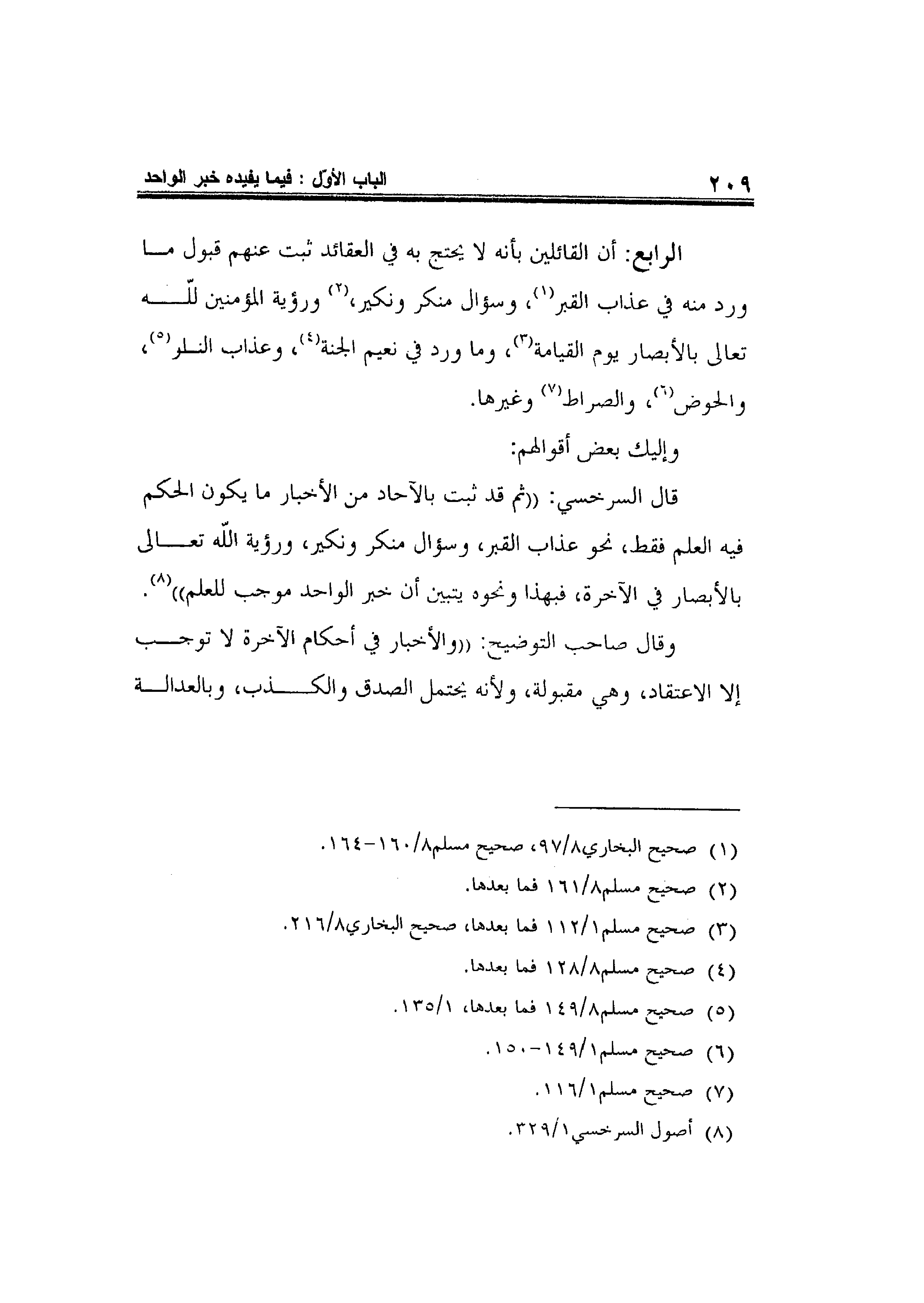 الرابع: أن القائلين بأنه لا يحتج به في العقائد ثبت عنهم قبول ما ورد منه في عذاب القبر1، وسؤال منكر ونكير،2 ورؤية المؤمنين لله تعالى بالأبصار يوم القيامة3، وما ورد في نعيم الجنة4، وعذاب النار5، والحوض6، والصراط7 وغيرها.