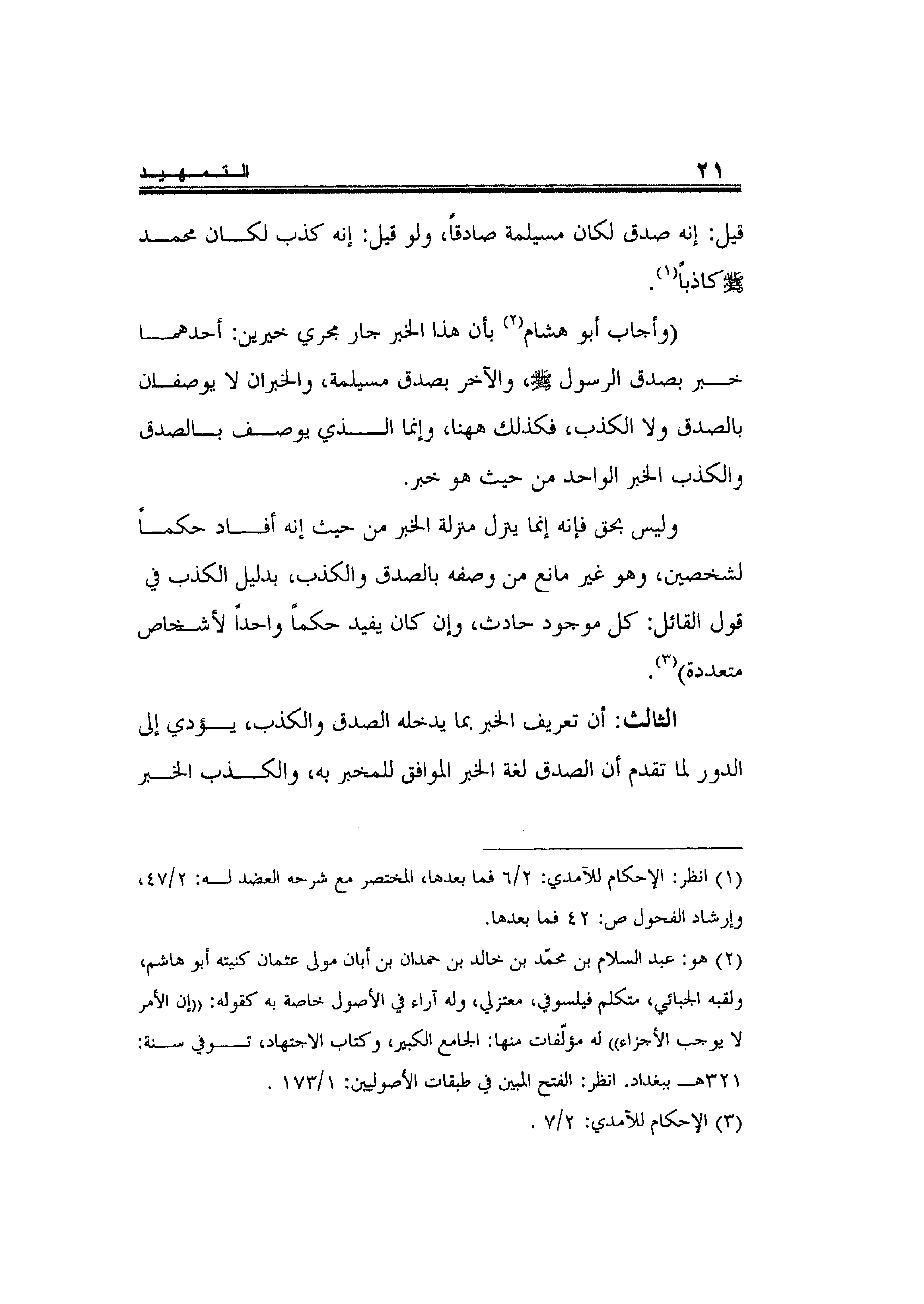 وأجاب أبو هشام2 "بأن هذا الخبر جار مجري خبرين: أحدهما خبر بصدق الرسول صلى الله عليه وسلم، والآخر بصدق مسيلمة، والخبران لا يوصفان بالصدق ولا الكذب، فكذلك ههنا، وإنما الذي يوصف بالصدق والكذب الخبر الواحد من حيث هو خبر. وليس بحق فإنه إنما ينزل منزلة الخبر من حيث إنه أفاد حكماً لشخصين، وهو غير مانع من وصفه بالصدق والكذب، بدليل الكذب في قول القائل: كل موجود حادث، وإن كان يفيد حكماً واحداً لأشخاص متعددة"3.